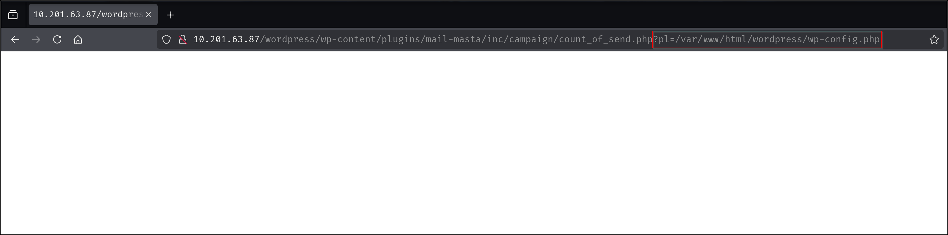 After researching suitable WordPress LFI targets, we can find that a file located at /var/www/html/wordpress/wp-config.php will sometimes contain sensitive information. If we attempt the LFI, we don’t get any output. This is because the include($_GET['pl']) line is executing the PHP code, not viewing it: