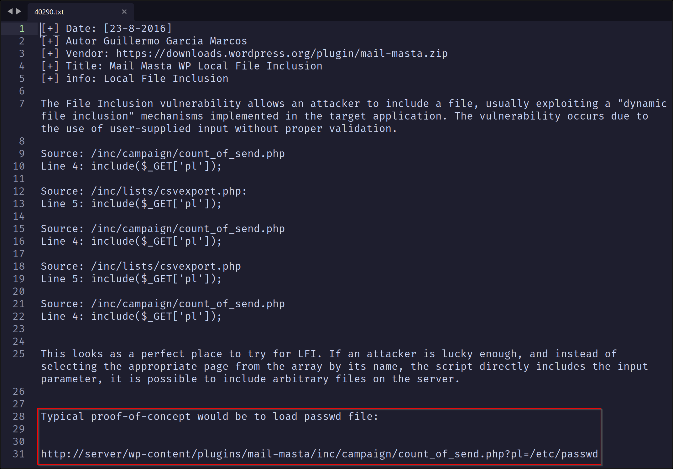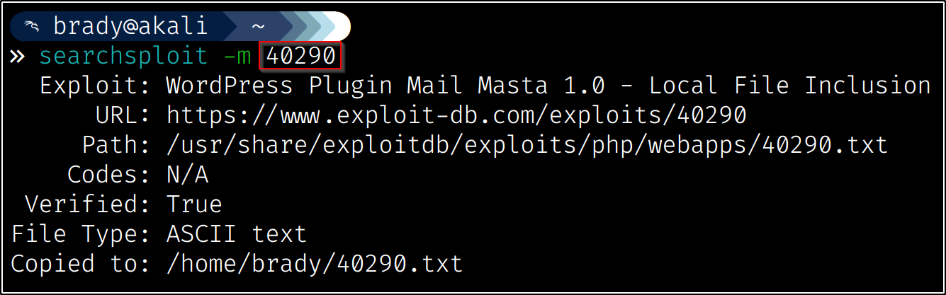Through trial and error, we can find the exploit that we want. In this case, we will mirror exploit 40290 to our local directory. Since this is just a text file, we can view the information in an application of choice: