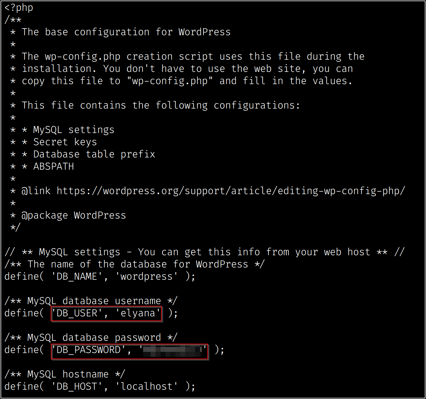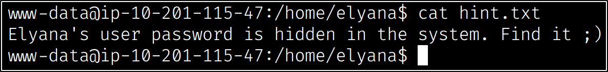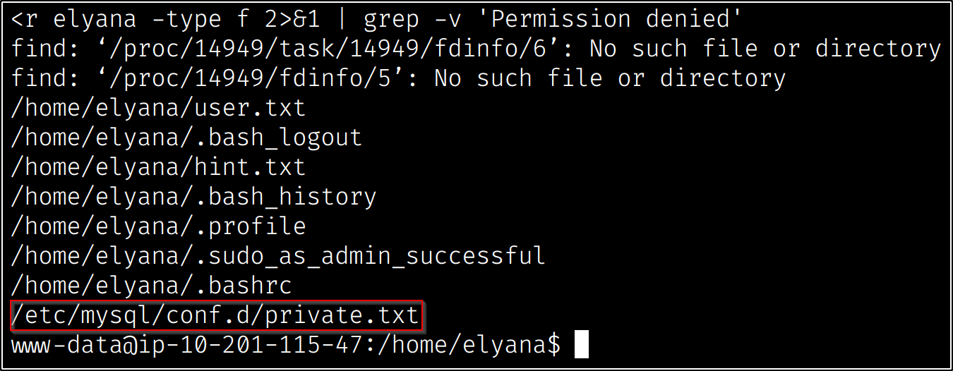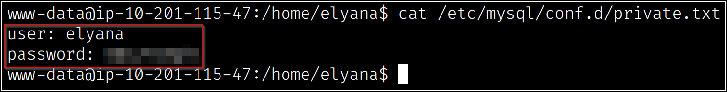 The next step is a bit of a stretch in my opinion, but after eventually checking for files owned by the elyana user using find / -user elyana -type f 2>&1 | grep -v 'Permission denied', we find /etc/mysql/conf.d/private.txt: