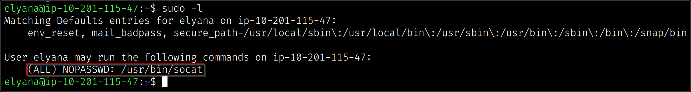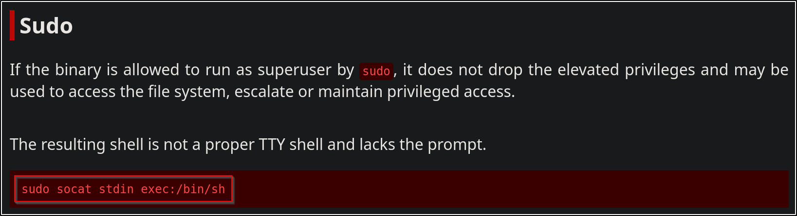 In this case, we are able to run socat with sudo with no password. We can check GTFOBins for known privilege escalation vectors with socat: