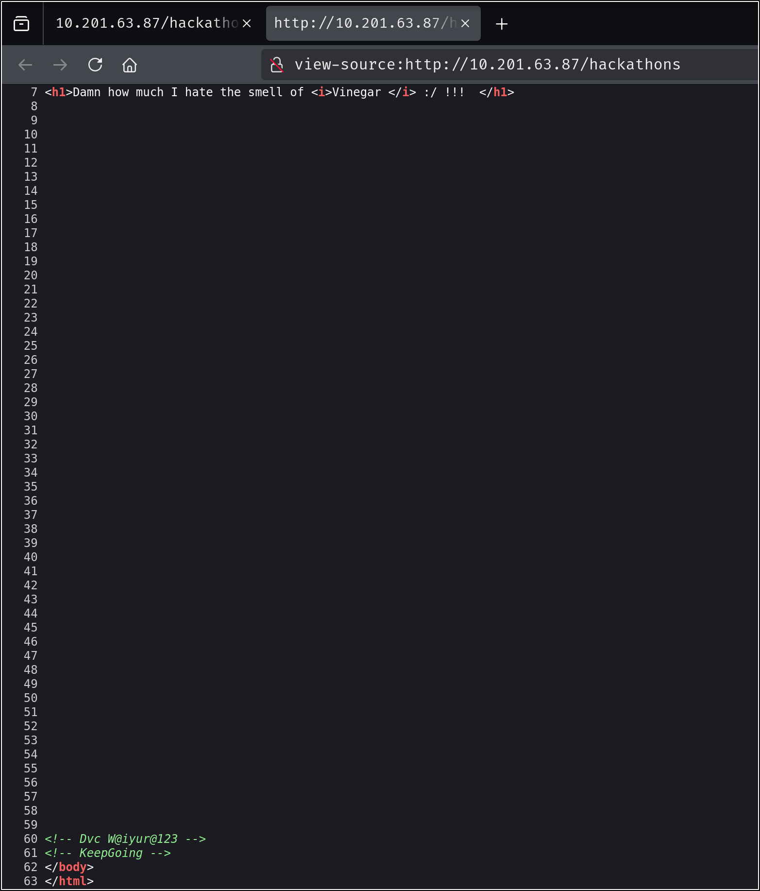 We find some information if we view the page source. We’ll take note of this HTML comment, as this may be sensitive information left carelessly by a developer: