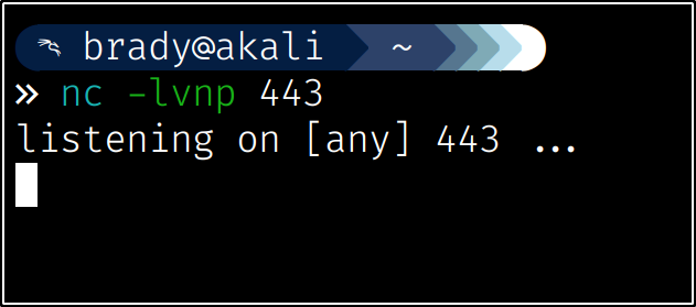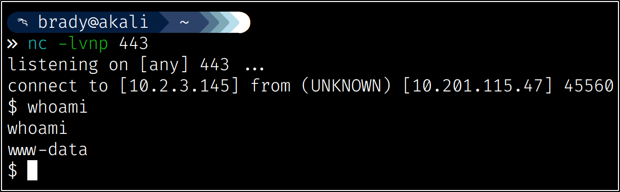 We can use the webshell to upgrade ourselves to a reverse shell. This is an extra step, since we could have used a plugin to get a reverse shell directly. We will need to start a listener using nc, after which we can connect back to the listener using our method of choice. We could use revshells.com (not pictured) to generate a payload that points to our VPN IP address.
