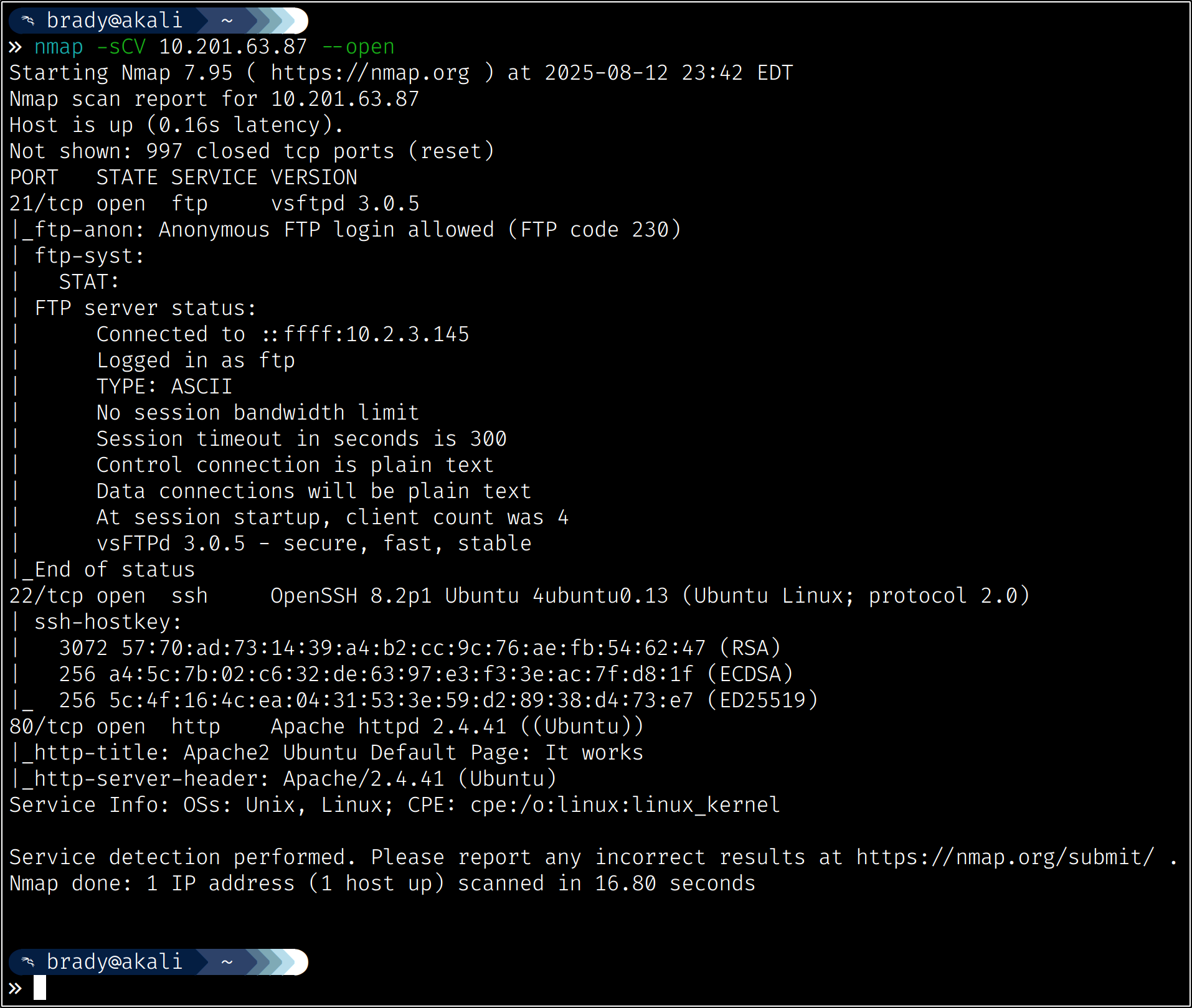Next, I ran a quick nmap scan to enumerate the service versions and run some basic nmap scripts against found ports: