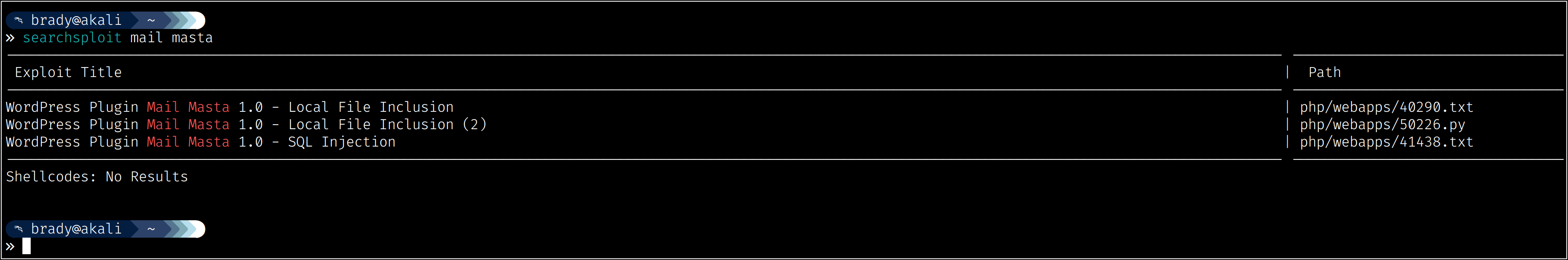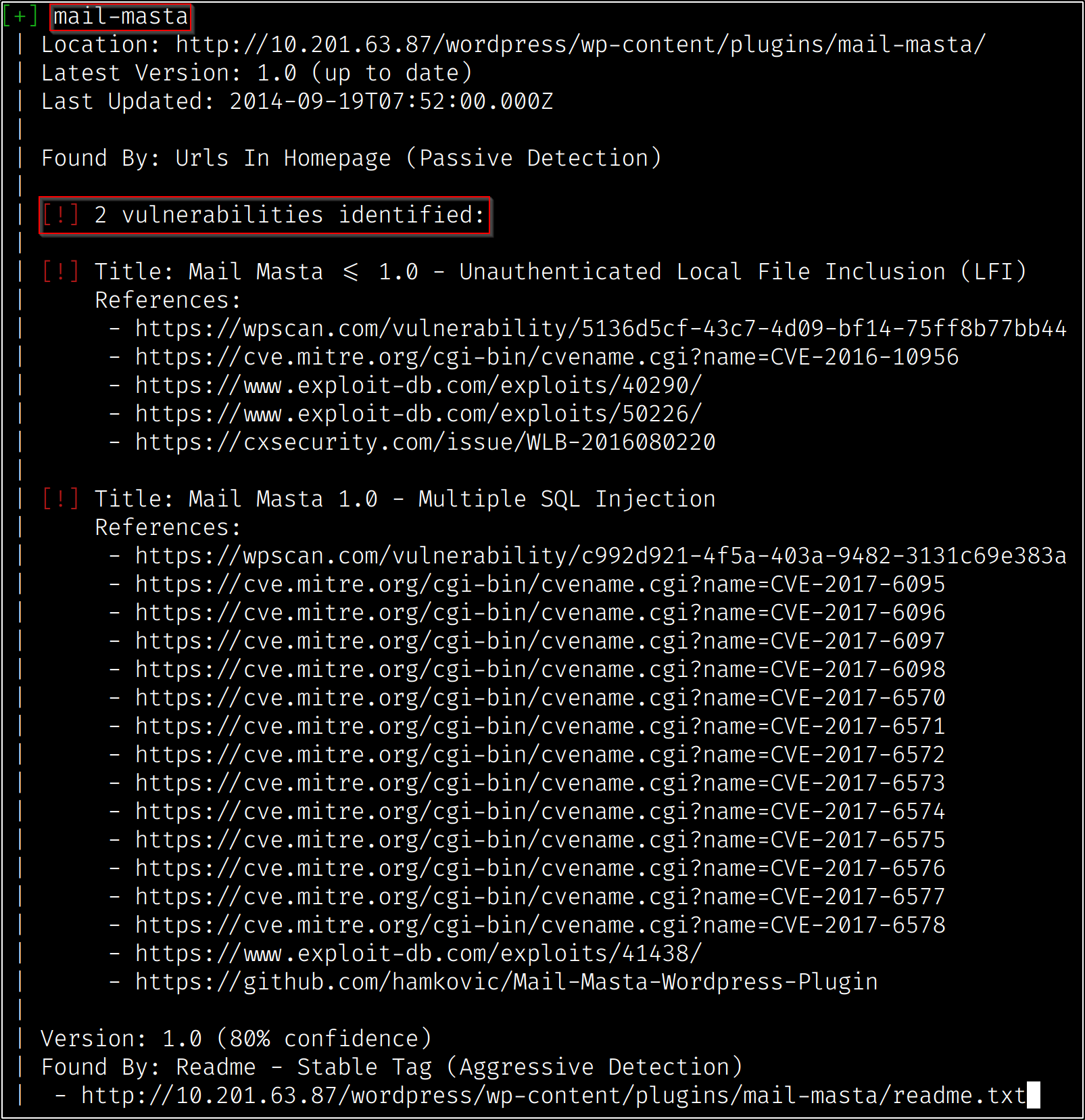 After looking through our output, we can see that a vulnerable version of a plugin called Mail Masta is installed: