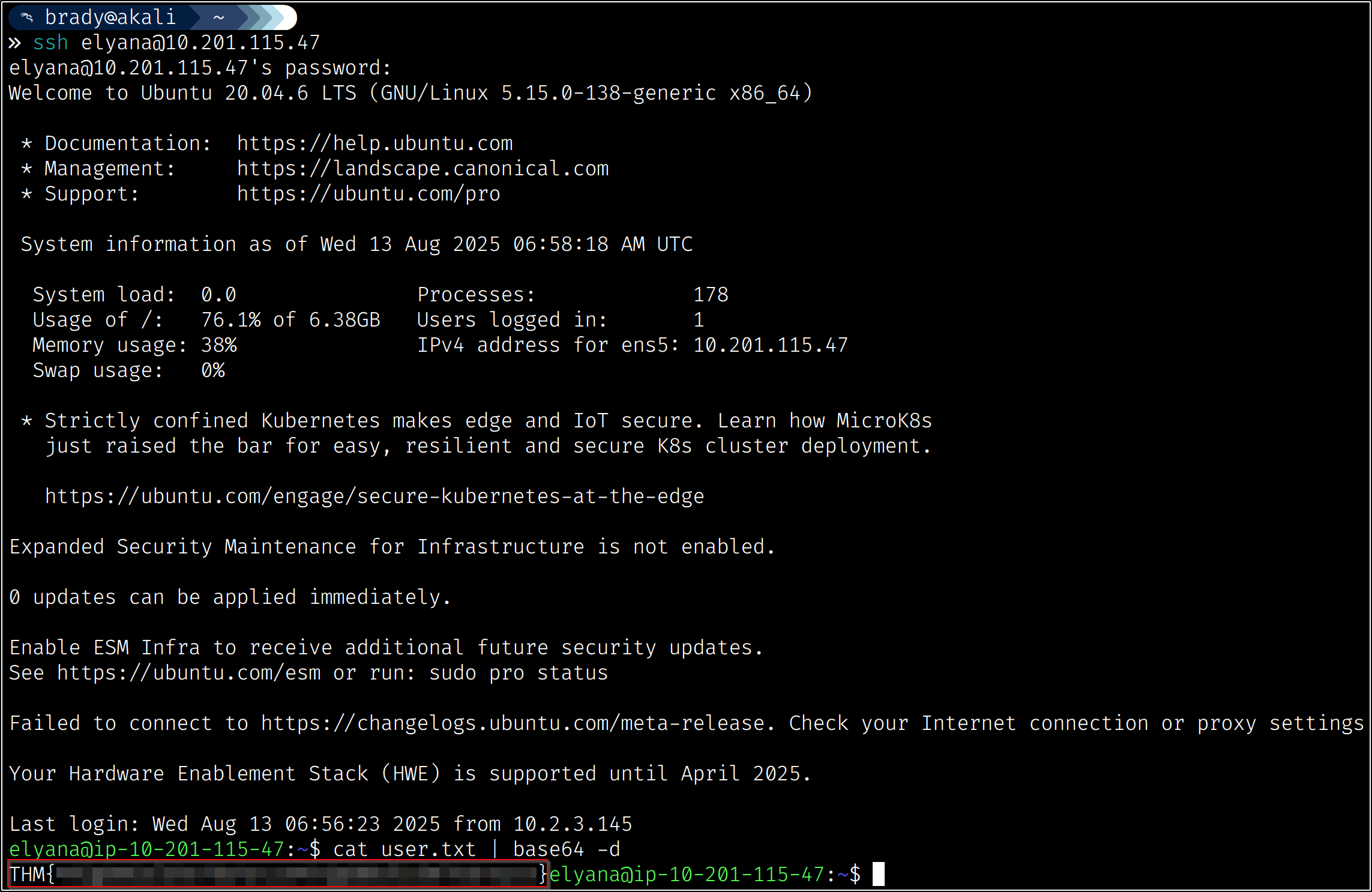 Now we are able to connect using SSH with this user’s valid credentials and read the user flag. For some reason, this room’s flags are encoded, but we can easily reverse this using a previously shown method: