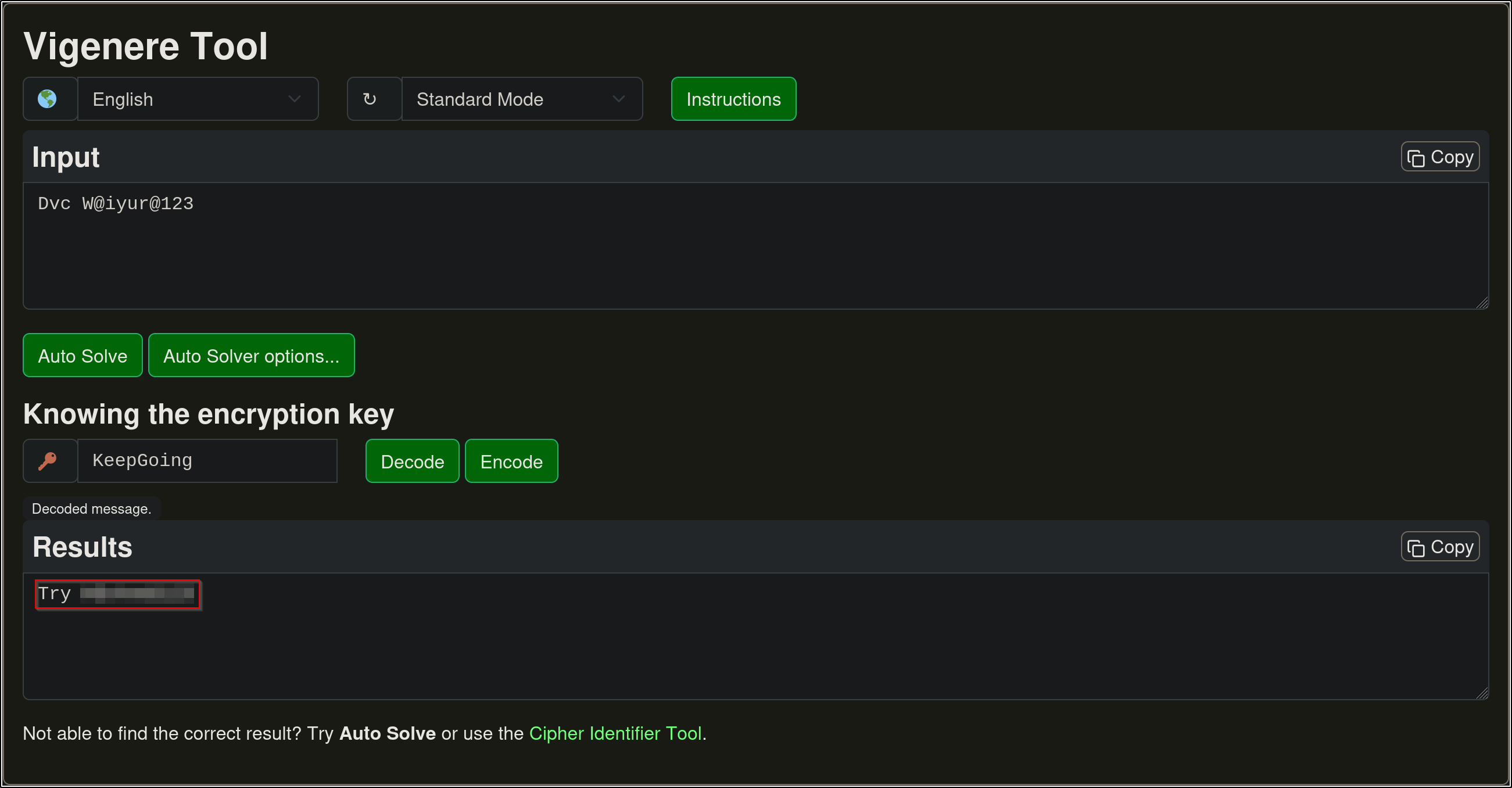 The hint with “Vinegar” is that this is a Vigenère cipher. We can decode the top line using the bottom line as the key with a Vigenère solver: