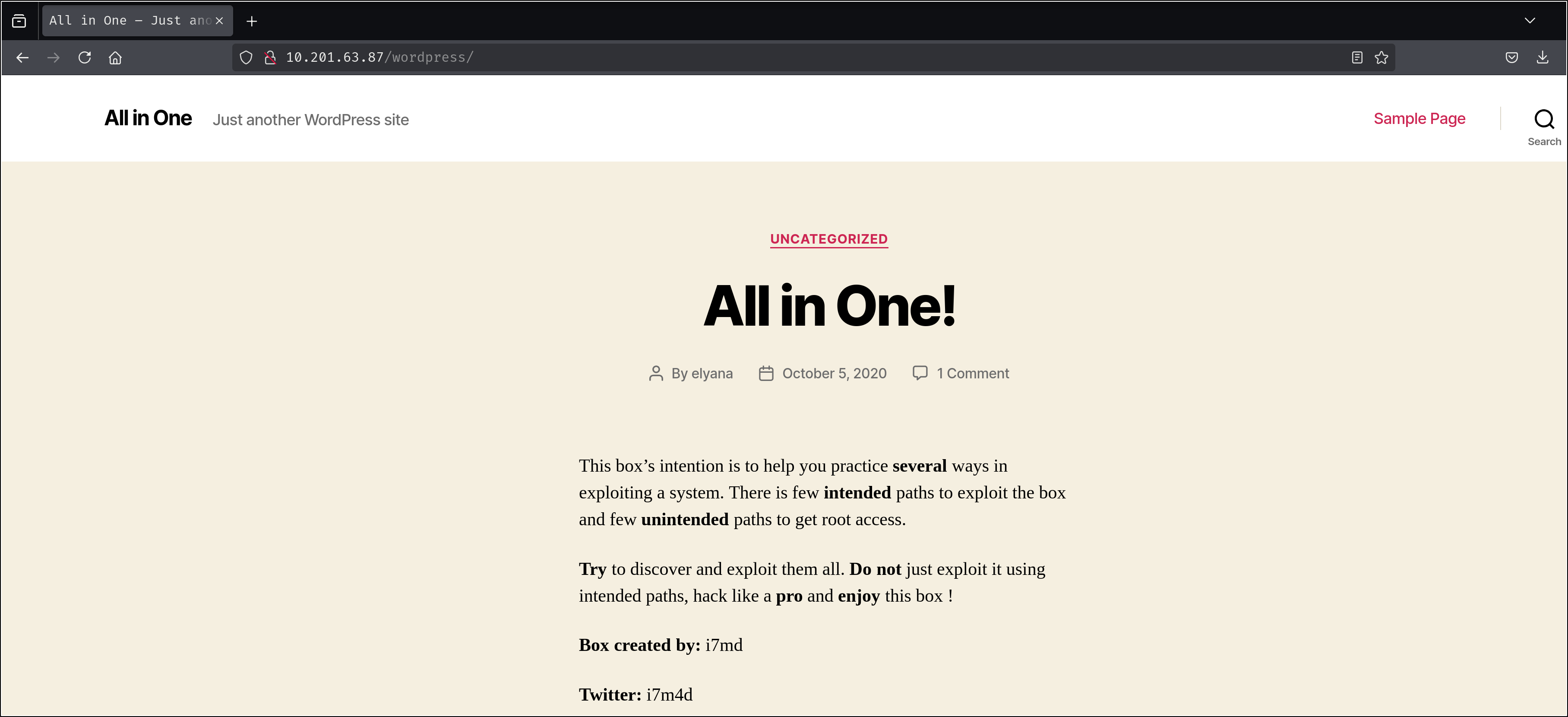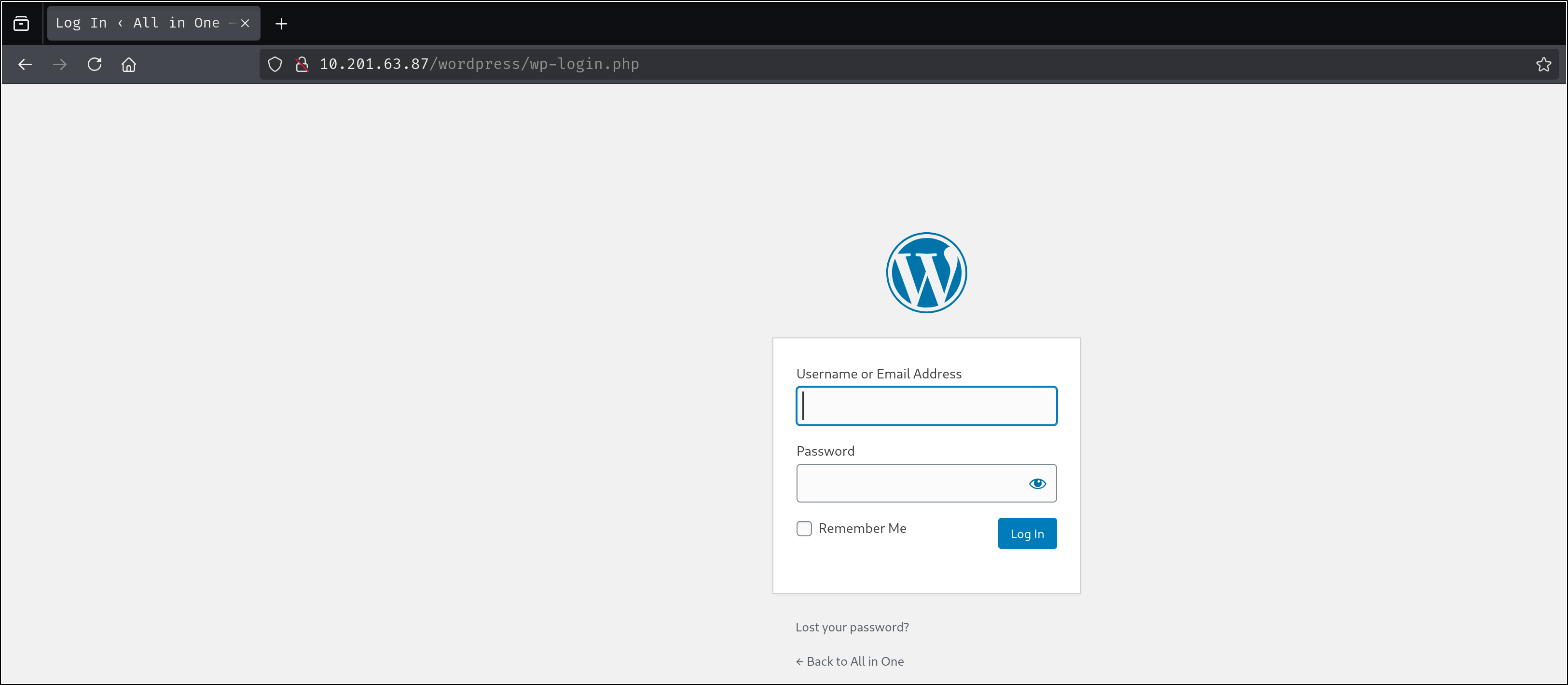 This is a write-up for the “All in One” lab, an easy room on TryHackMe. This is a free room located at https://tryhackme.com/room/allinonemj. I am documenting the process I used to find all information in this writeup WITHOUT including any flags, in the spirit of the game. However, following this process exactly should result in a full compromise of the target system.