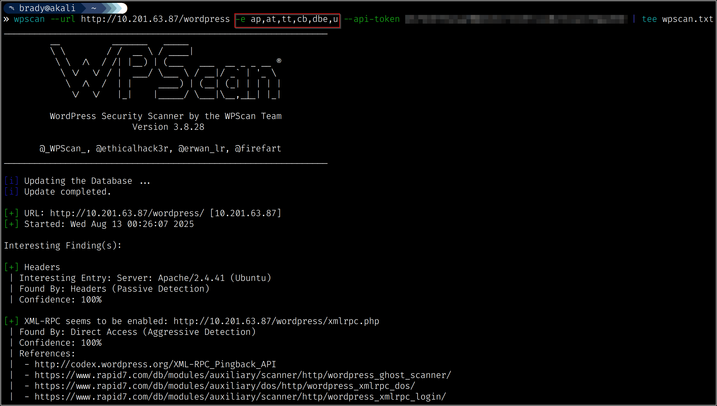 Notice that I’m also using tee to write the output to a file - wpscan will typically take a LONG time with the given options, and usage of the API key is limited, so we wouldn’t want to have to run this more than once. This is obviously not the most efficient option, but more of a catch-all to demonstrate what you might do if you needed to save API requests and didn’t know what to look for.