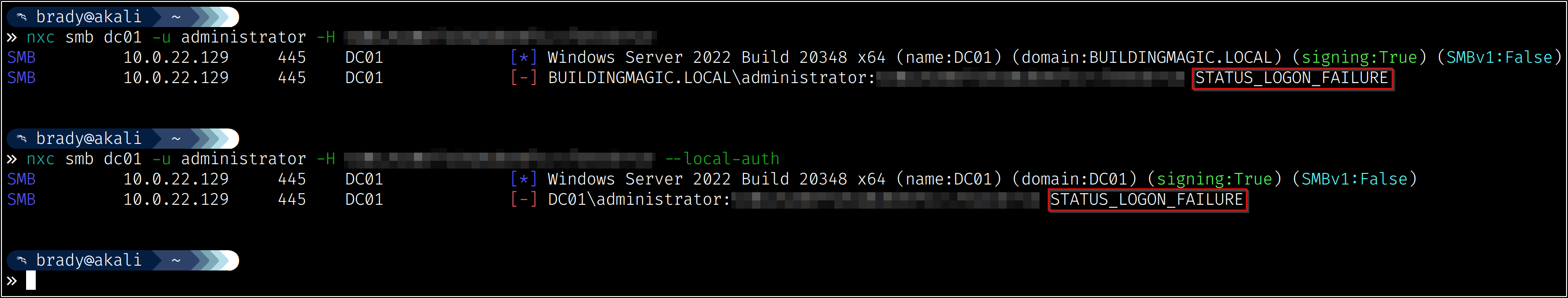 Curiously, the “Administrator” user’s hash does not appear to work, even when attempting --local-auth: