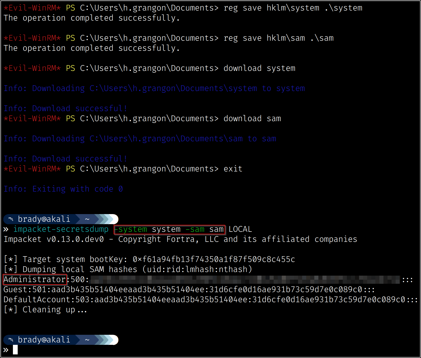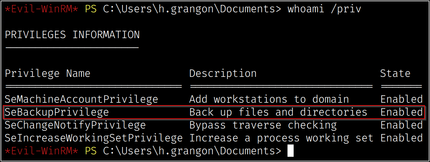 With a quick privilege check, we can see that the “h.grangon” user has SeBackupPrivilege. We can use this permission to back up the HKEY_LOCAL_MACHINE\SYSTEM and HKEY_LOCAL_MACHINE\SAM hives, allowing us to dump the machine’s SAM offline: