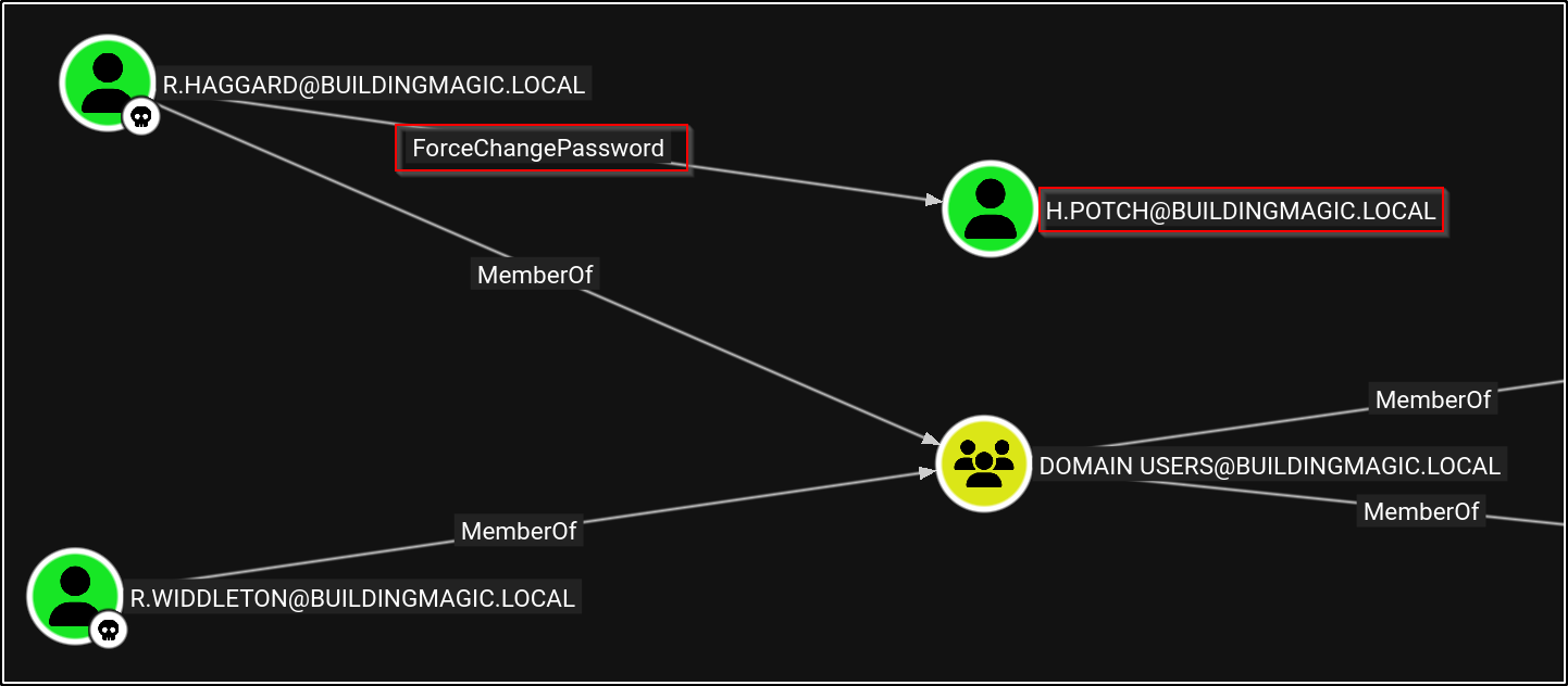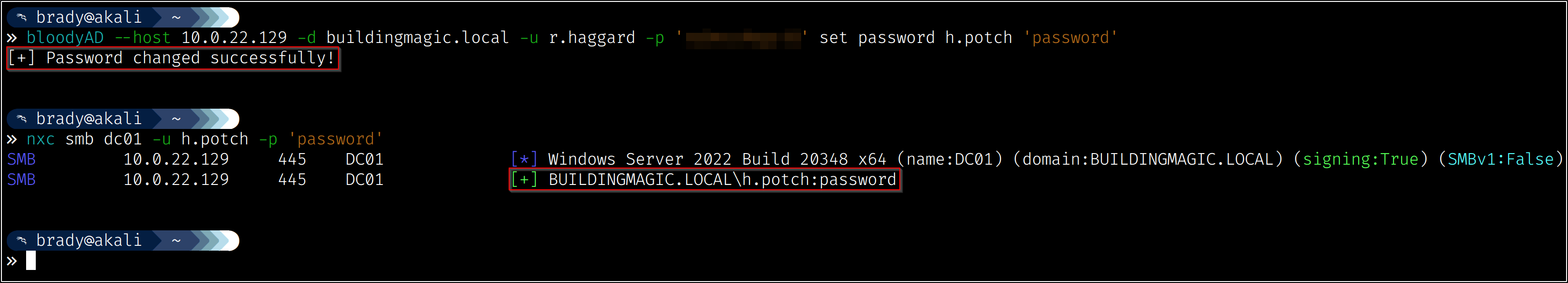 We can use a tool of our choosing (I like bloodyAD) to change the “h.potch” user’s password:
