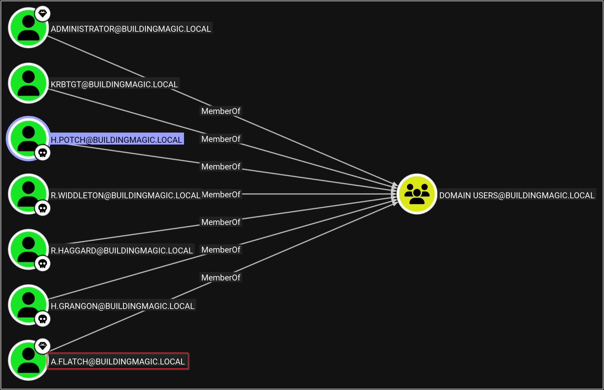 Rechecking our domain users in BloodHound, we see that we have one remaining user, the “a.flatch” user, who is a member of the “Administrators” group: