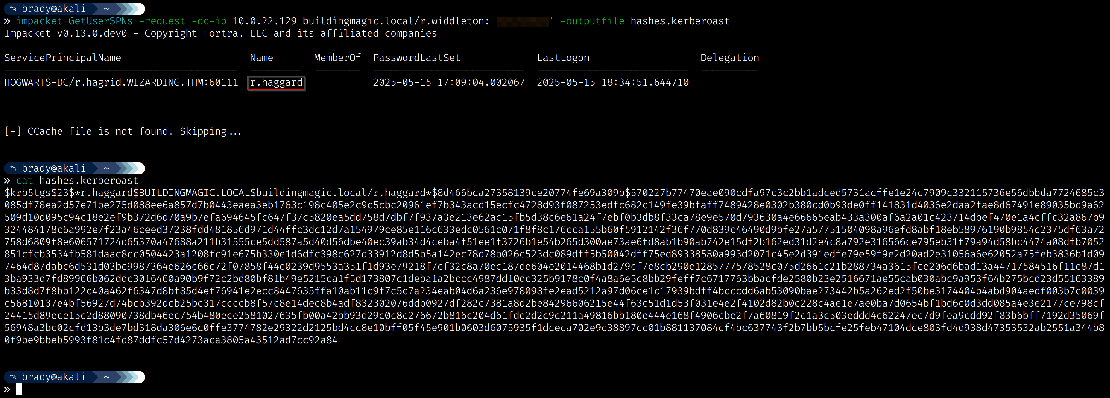 We’ll save this data to use in a moment. Next, we can check for Kerberoastable users with ‘impacket-GetUserSPNs’: