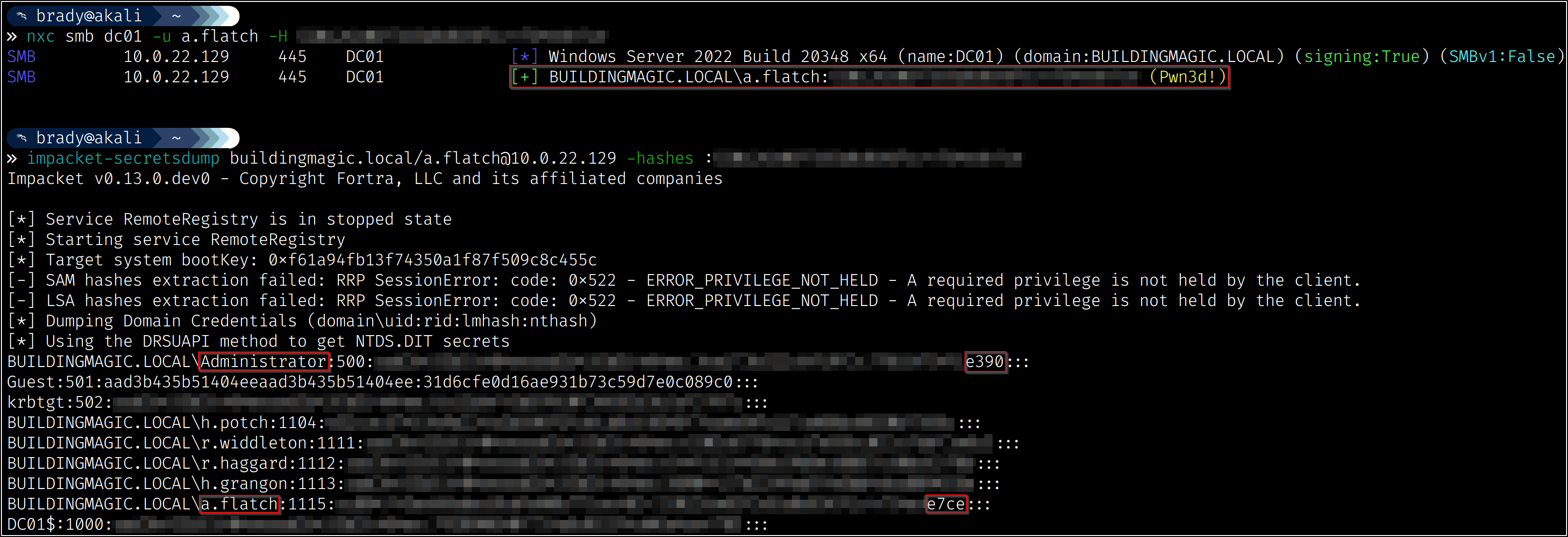 If we pass the “Administrator” hash from the SAM to our user, we are able to log in successfully. Because this user is a member of the Administrators group, we are able to dump the NTDS.dit file, containing the hashes for all domain users: