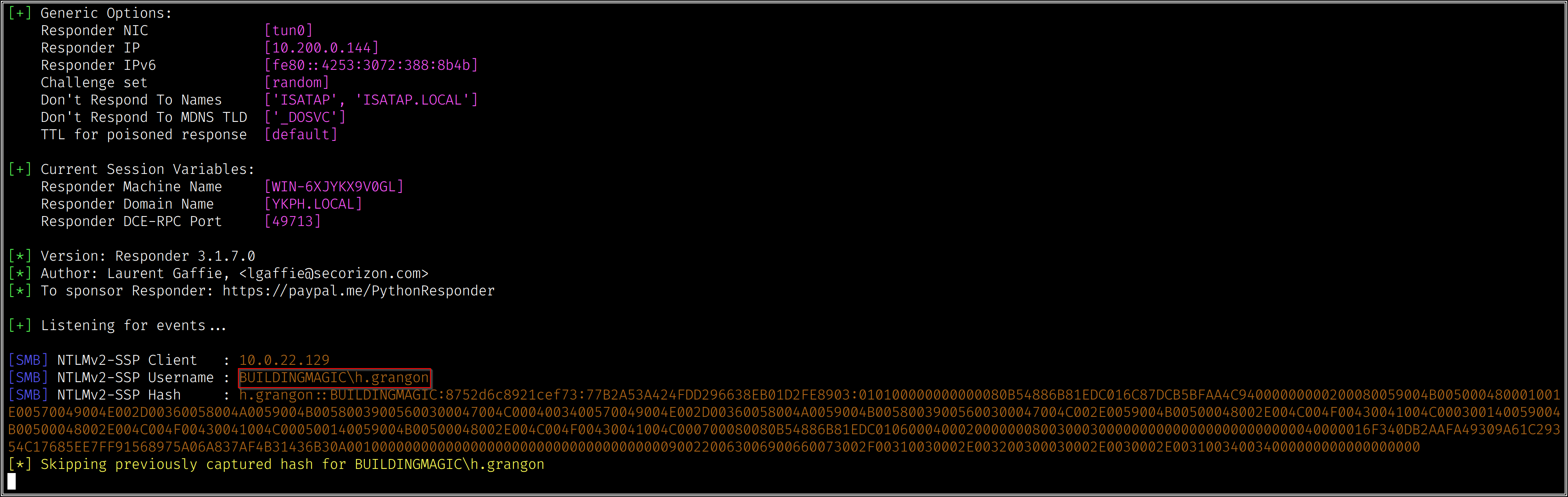 When a user opens the share, we can force the user into accidentally authenticating to a responder listener and capture a NetNTLMv2 hash for this user: