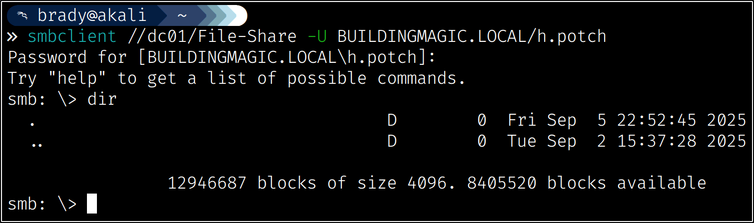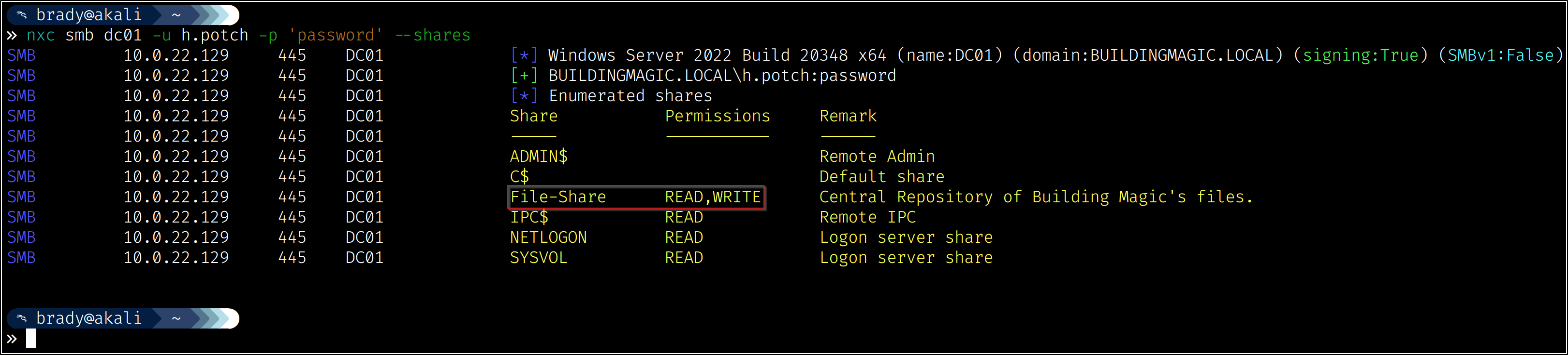 Now that we have unlocked another user, it’s time to see what we can do with their access. It looks like the “h.potch” user has read/write access to a file share: