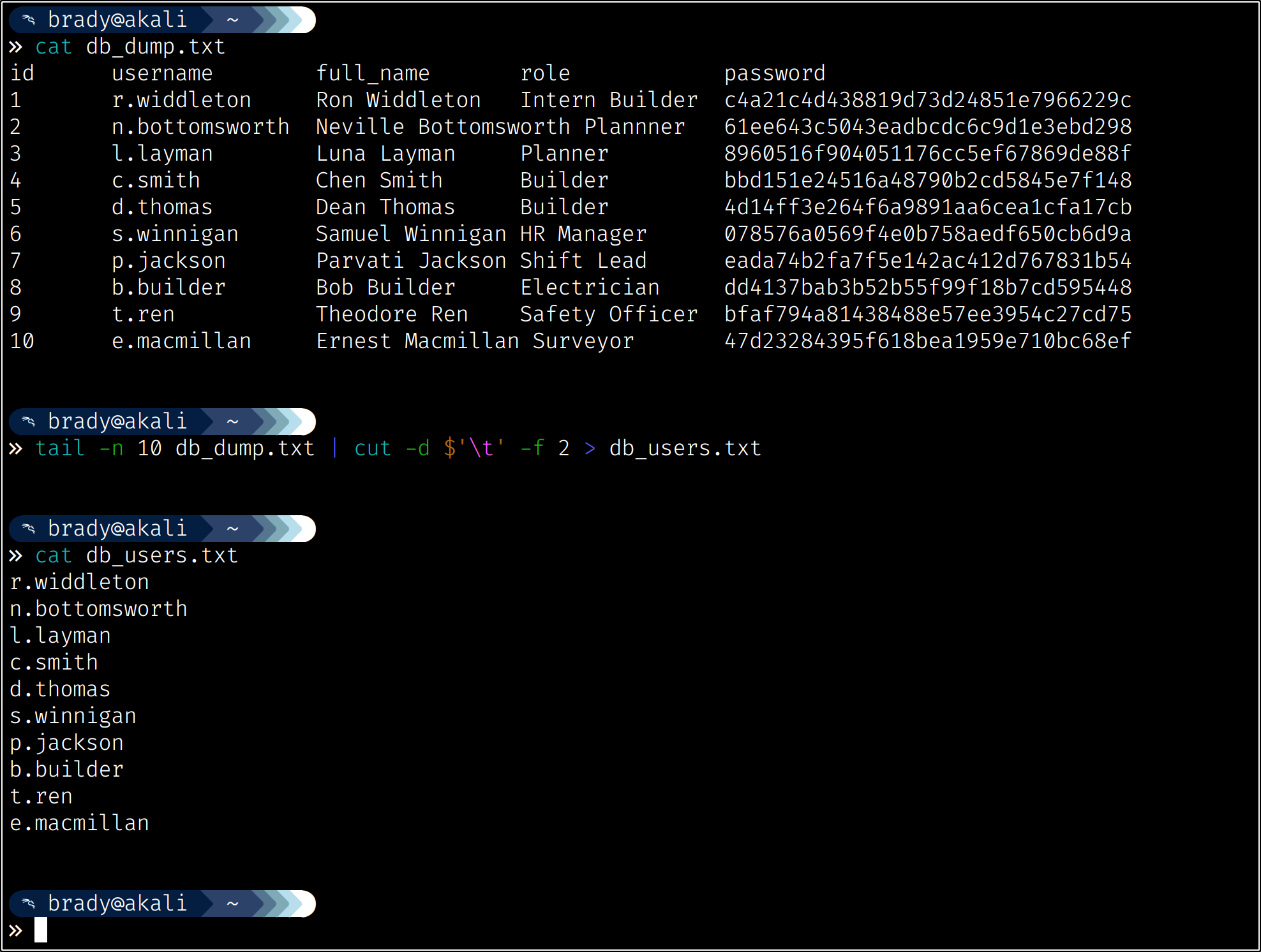 To create a list of potential users, I am going to use the cut command to clean up this list a bit: