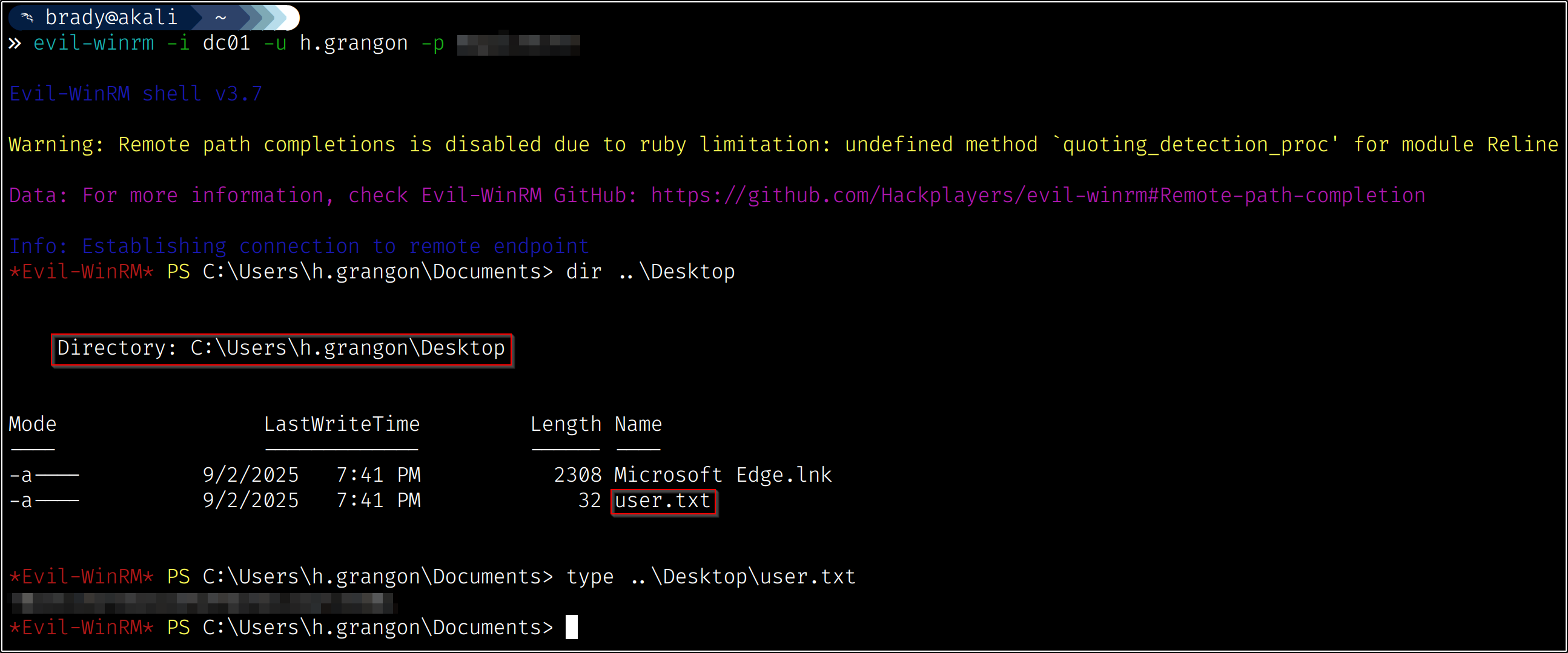 Because the “h.grangon” user is a member of the “Remote Management Users” group, we are able to connect to the domain controller using WinRM: