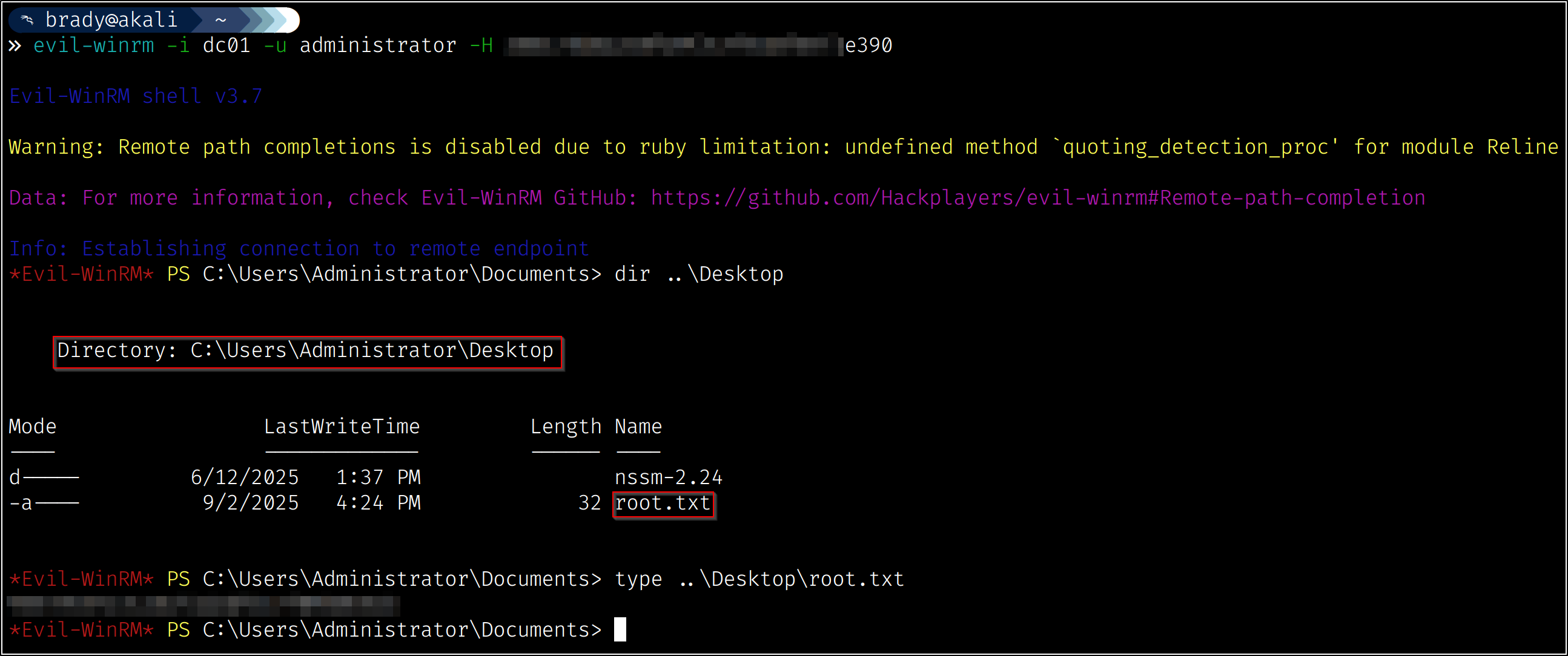 With the “Administrator” user’s true hash (or with a.flatch, it doesn’t matter), we can WinRM into the machine and claim the root flag: