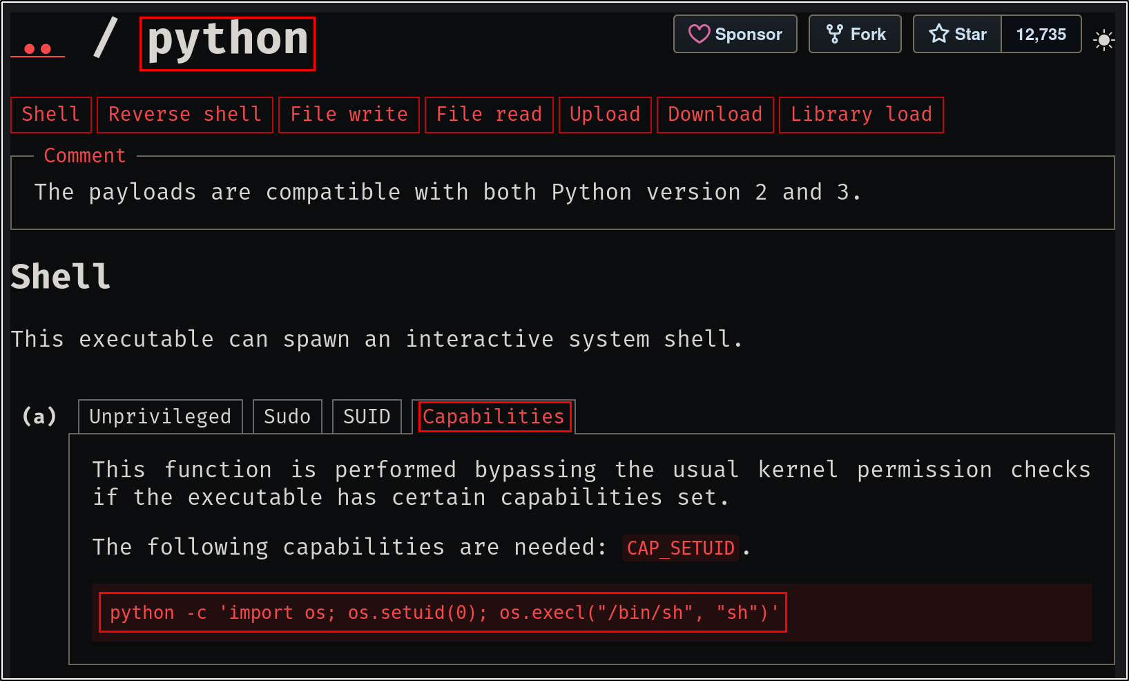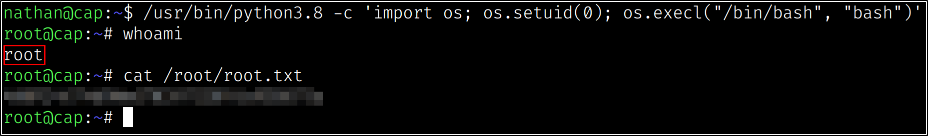 Because the SetUID capability is enabled for /usr/bin/python3.8, we can abuse this to run arbitrary Python code as a specified user. GTFOBins has an example of how to weaponize this, specifying the UID of the root user (0):