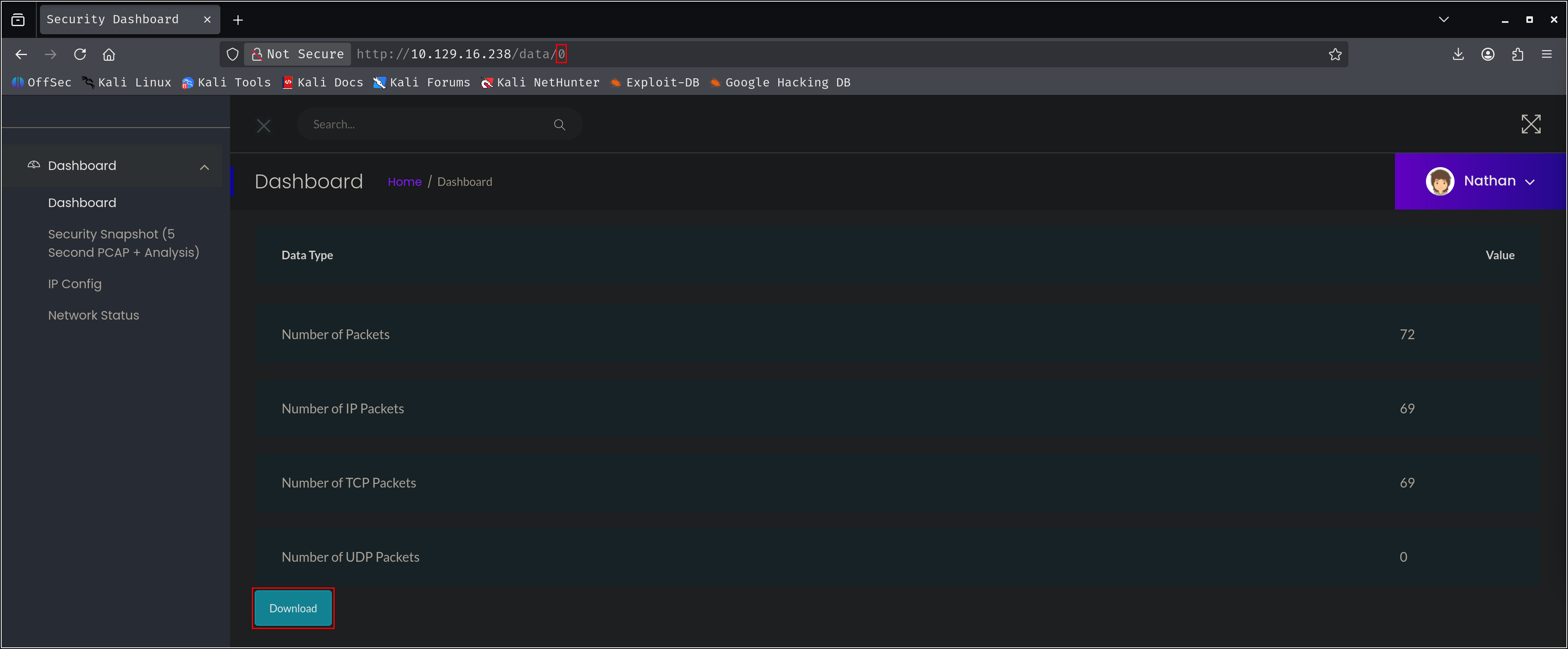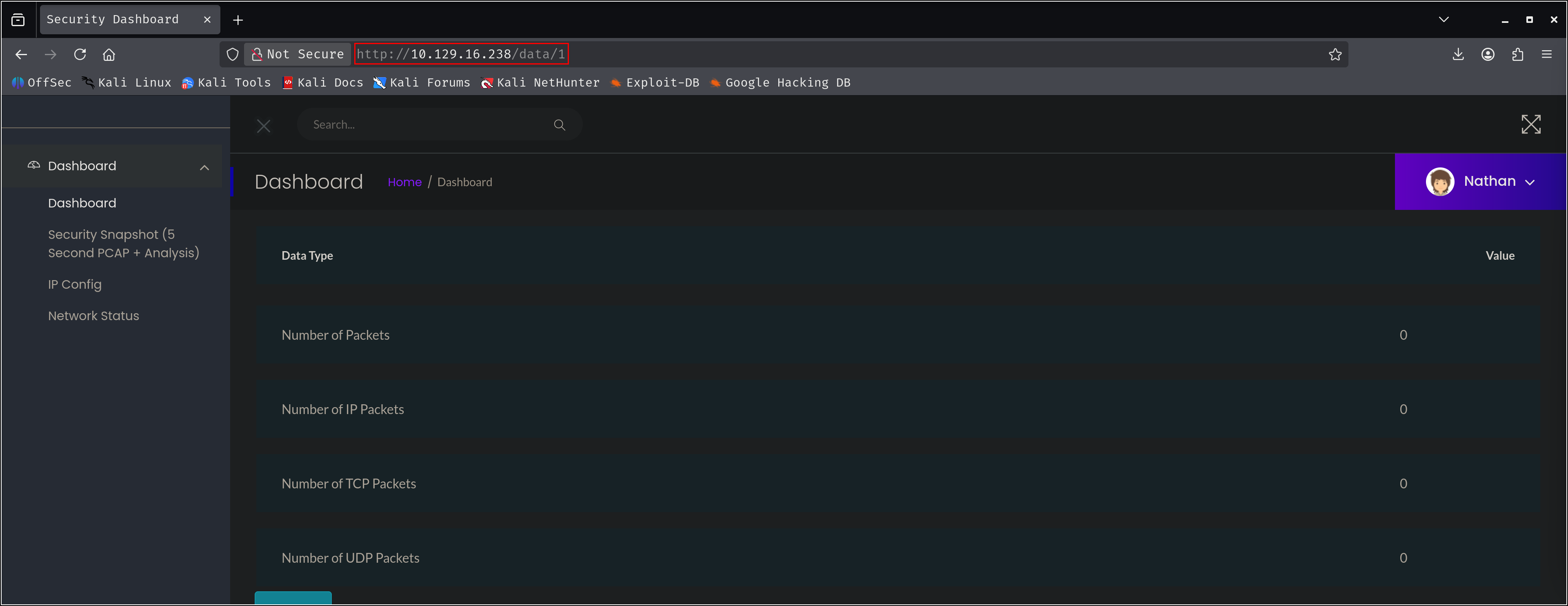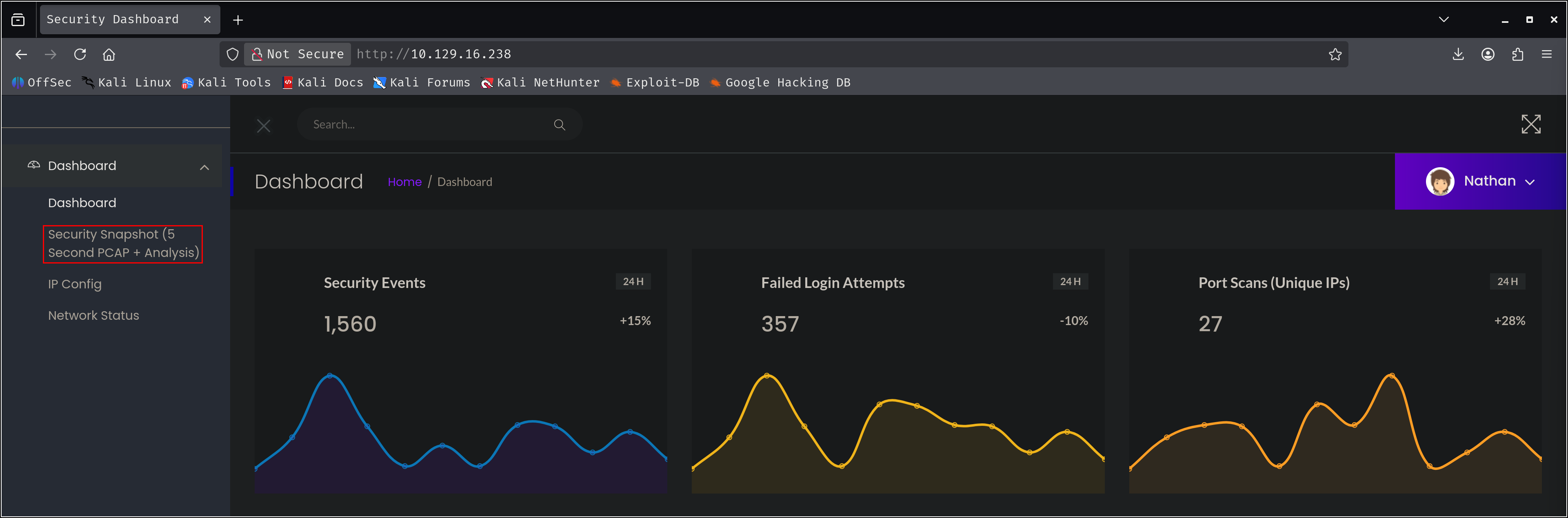 We can see that we are somehow already authenticated as “Nathan,” giving us access to a dashboard. Clicking the “Security Snapshot” node will take us to a packet capture of the system: