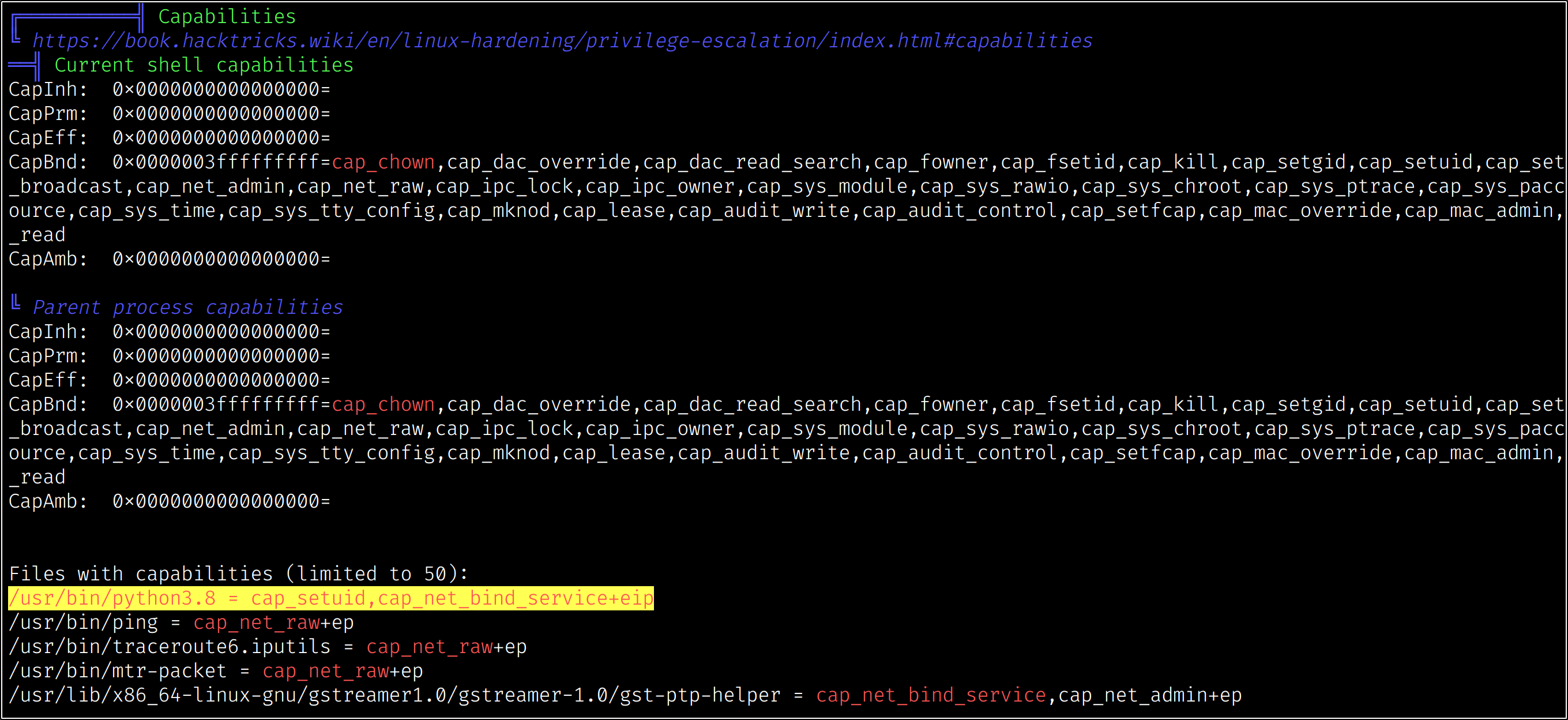 We can see that LinPEAS clearly identifies a dangerous capability: