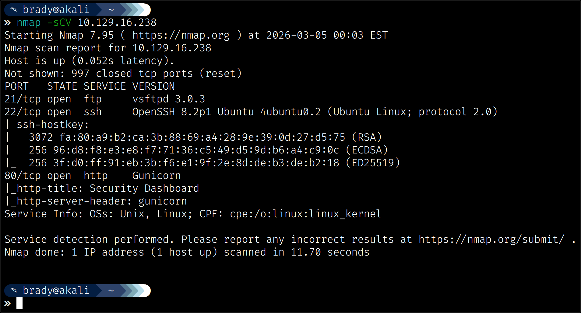 We see that we have FTP, which we may be able to access anonymously, SSH, which will help us if we find some credentials to use, and a Gunicorn web server running on port 80.