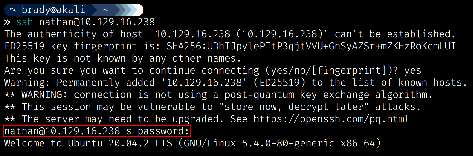 Credential reuse is a common network weakness caused by the convenience of using the same password for multiple systems or services. Let’s see if we can use the “nathan” user’s FTP password to access the server via SSH: