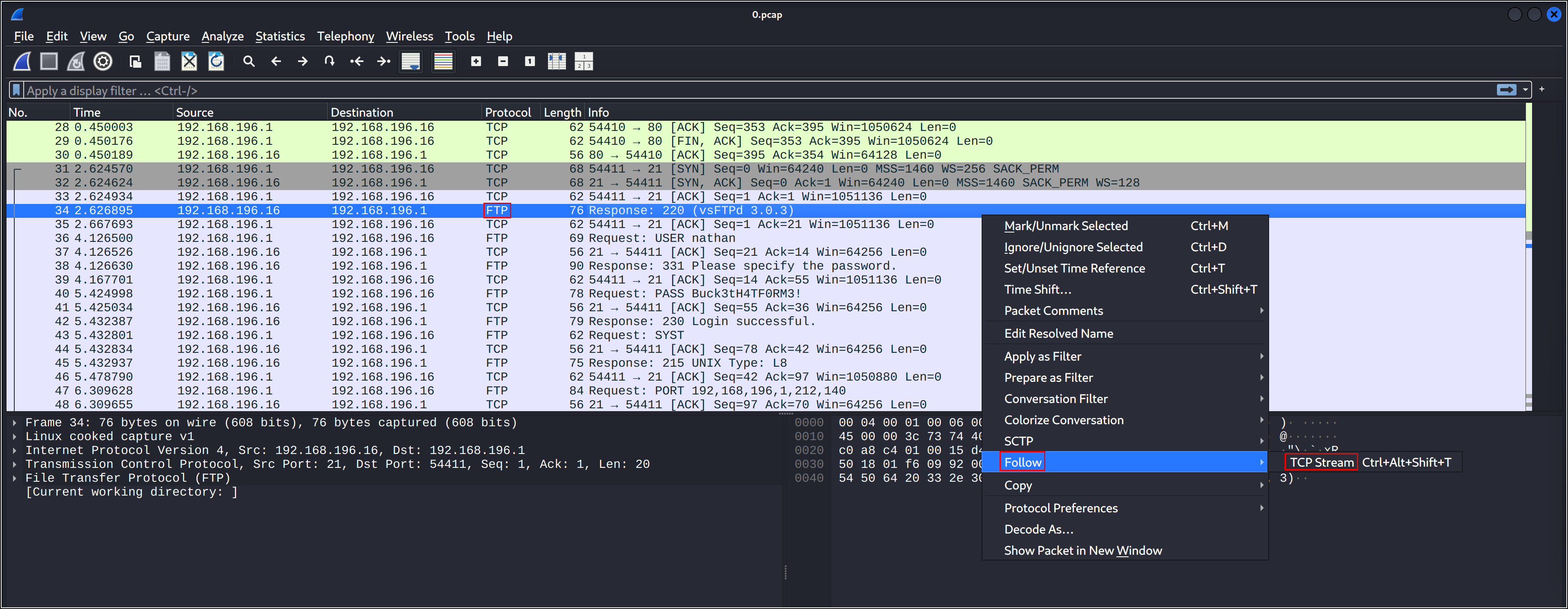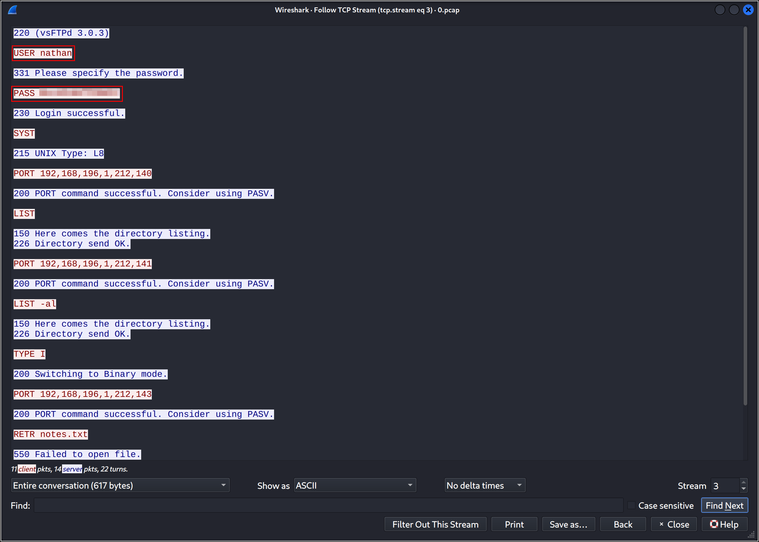 We can see that a user called “nathan” authenticated to FTP, and we can see the password!
