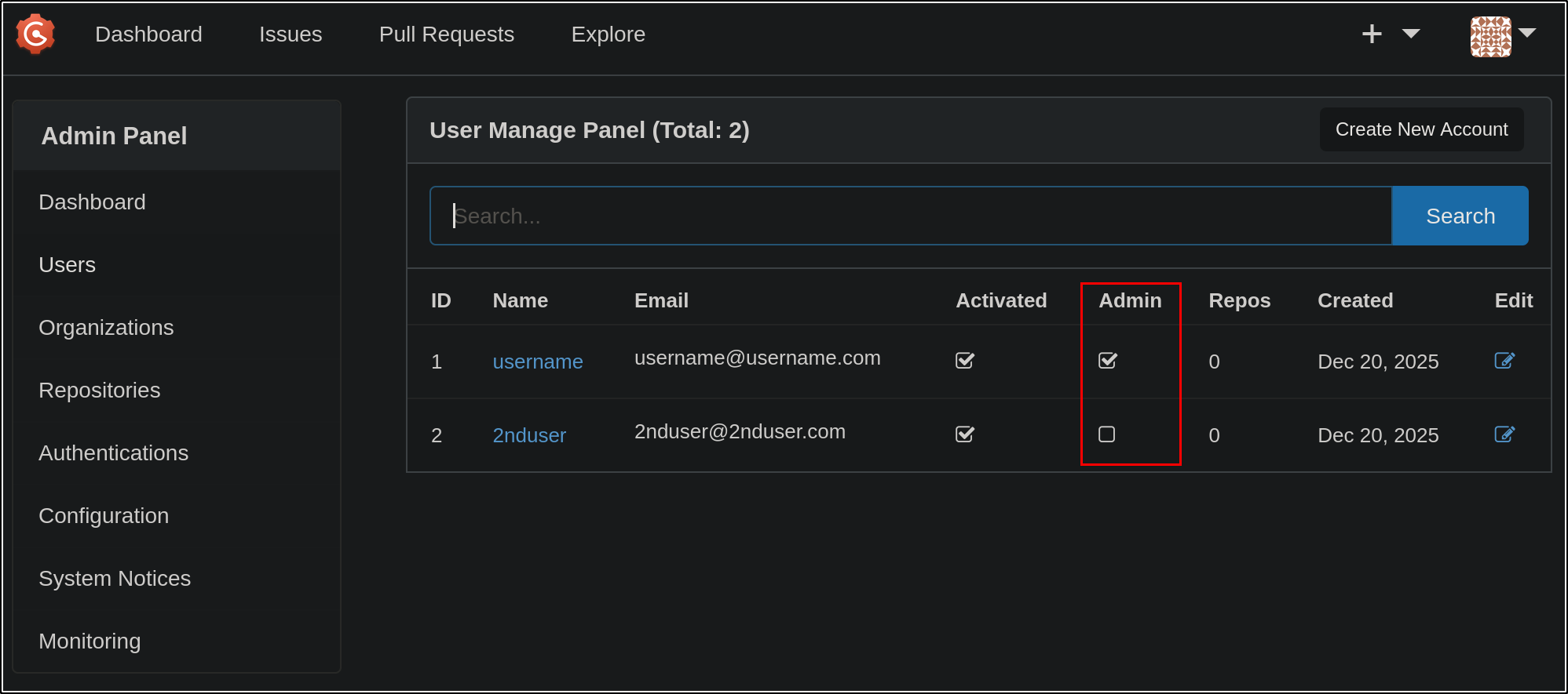 NOTE: This is NOT a walkthrough step, but when I created a second user, this user is NOT an admin. It seems like the first user created becomes an admin automatically, but this is not the case for all users. The MetaCTF team could mitigate this in future challenges by having the container spawn with a pre-seeded admin user to prevent new users from automatically becoming admin users.