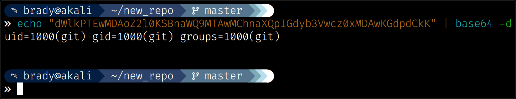 Decoding the output confirms our RCE, showing that we can run arbitrary OS commands as the “git” user: