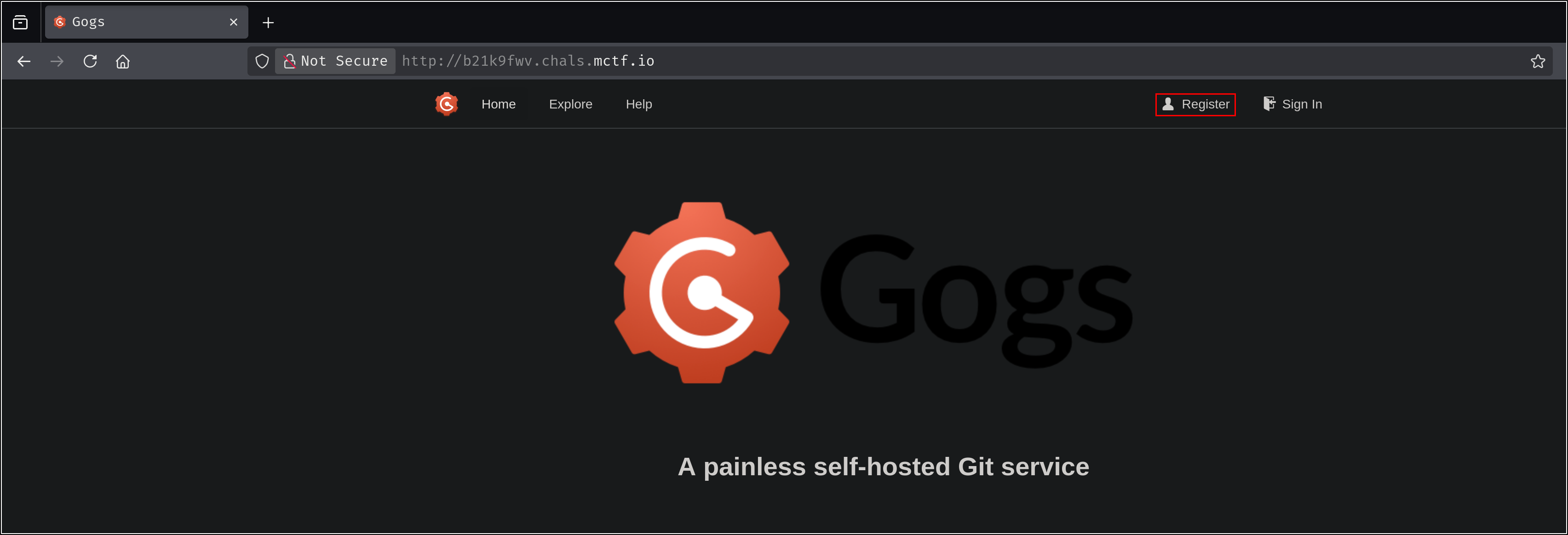 On running the container, we get access to the Gogs homepage on the web root. From here, we are able to register a user.