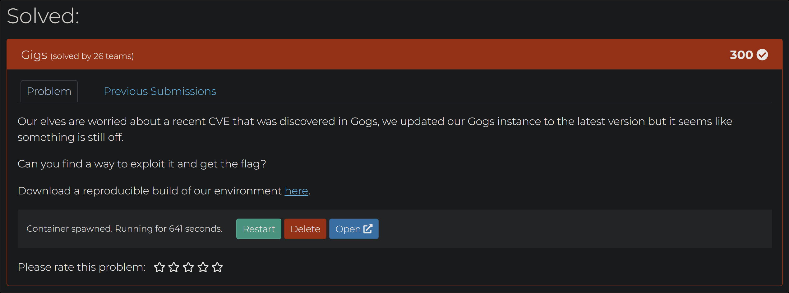 This is a write-up of the solve path I used for the December 2025 MetaCTF Flash challenge “Gigs.” This challenge was initially released at 350 points, but was downgraded to 300 points before the close of the scoreboard. I placed 53rd of 447 scoring competitors. The challenge was intended to be solved by exploiting CVE-2025-8110, but the attack path I discovered was far simpler to execute.