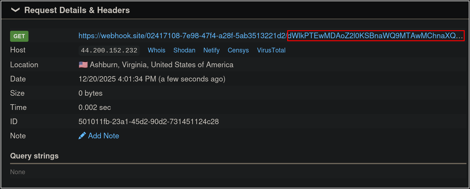 For initial weaponization, I’ll confirm remote code execution (RCE) by making a curl request to a webhook (for example, you could also use a site that you control, but this is quick and easy for demonstration), passing the base64-encoded output of a command as the requested asset:
