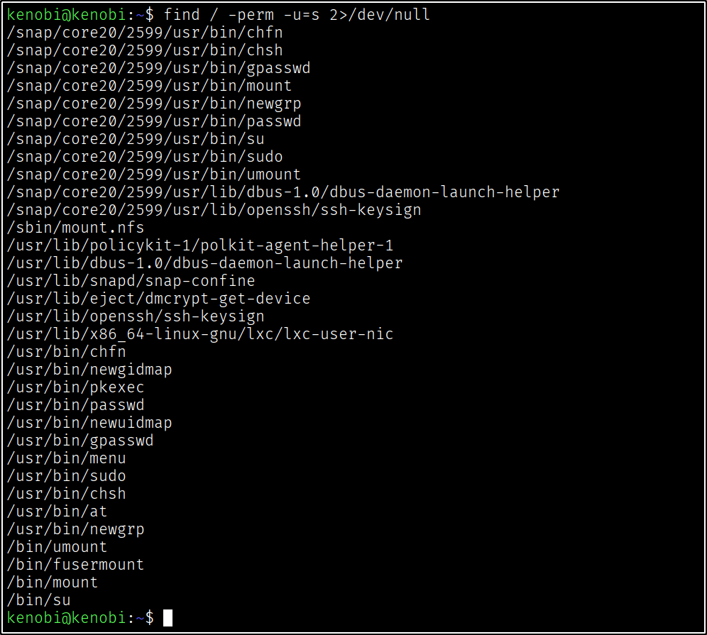 Now that we have an SSH session as the “kenobi” user, we can perform some preliminary privilege escalation checks. After striking out on sudo -l, as we do not have the “kenobi” user’s password, we find a non-standard binary with SUID permissions:
