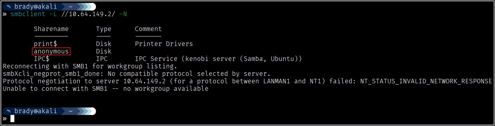 We see that we have FTP, SSH, an Apache web server, and several file-sharing services. We can see that the machine is running Samba, an interoperability service for using SMB on Linux servers. Since this will behave just like Windows SMB, let’s see if we are able to access any of the shares unauthenticated: