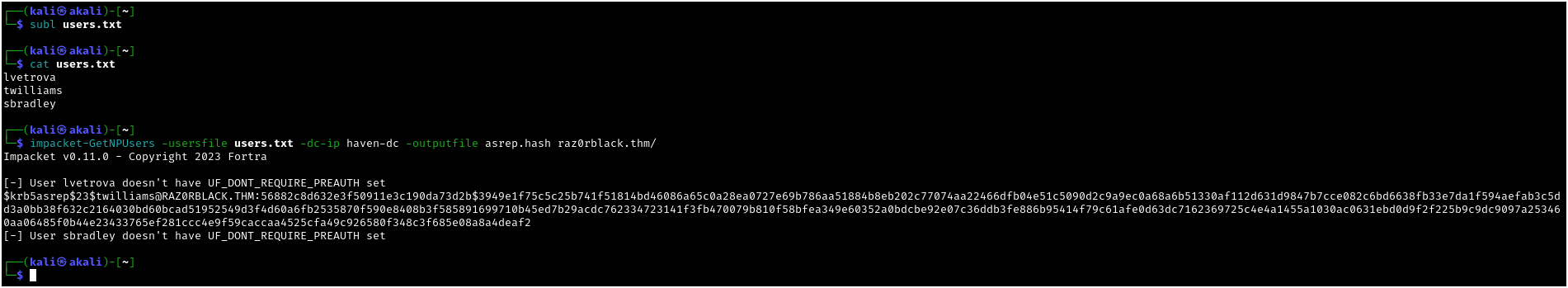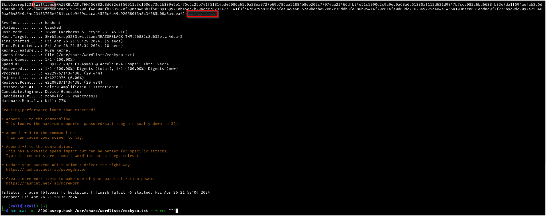 Since one of the users, twilliams, does not require Kerberos pre-authentication, we can perform an AS-REP roasting attack to extract a KRB5ASREP hash for the user:
