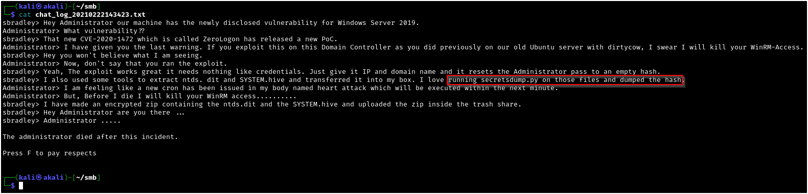 Note that the chat logs make reference of ZeroLogon - I have checked with zerologon_tester.py and found that this DC is probably not vulnerable to ZeroLogon at this time.