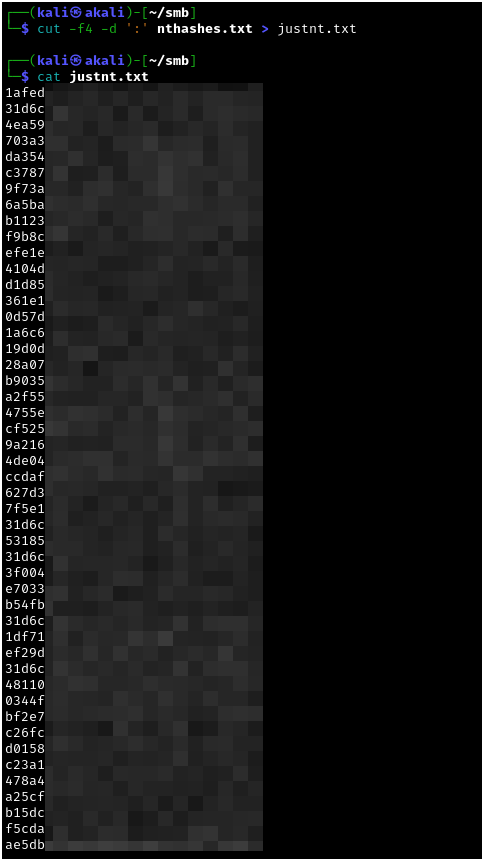 After we remove the impacket header and footer manually, we can use cut to remove everything except for the NT hashes by specifying the delimeter of : and extracting the fourth field: