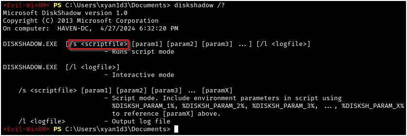 To get around this shortcoming, we can use the /s parameter to pass a script to diskshadow, which will run our commands automatically: