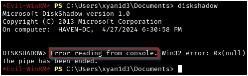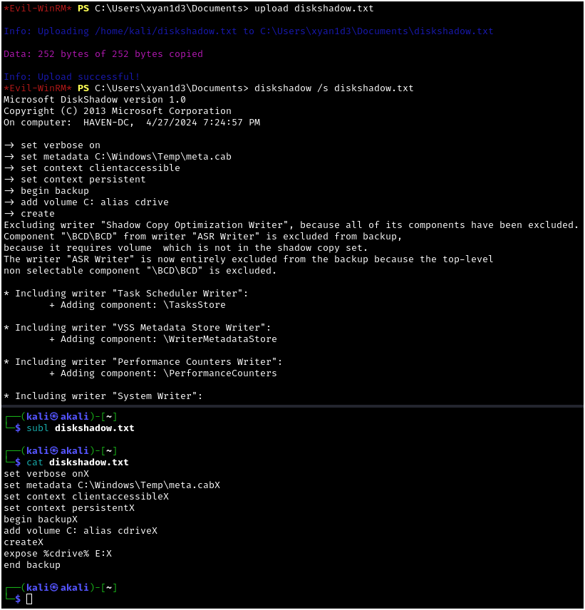 A good resource for this privilege escalation is from Nairuz Abulhul at https://medium.com/r3d-buck3t/windows-privesc-with-sebackupprivilege-65d2cd1eb960. Because the SeBackupPrivilege allows us to make backups of the filesystem, we can use diskshadow to make a shadow copy of the entire C:\ drive and extract the NTDS.dit file. However, using diskshadow from evil-winrm is slightly complicated, as we are not able to get an interactive console: